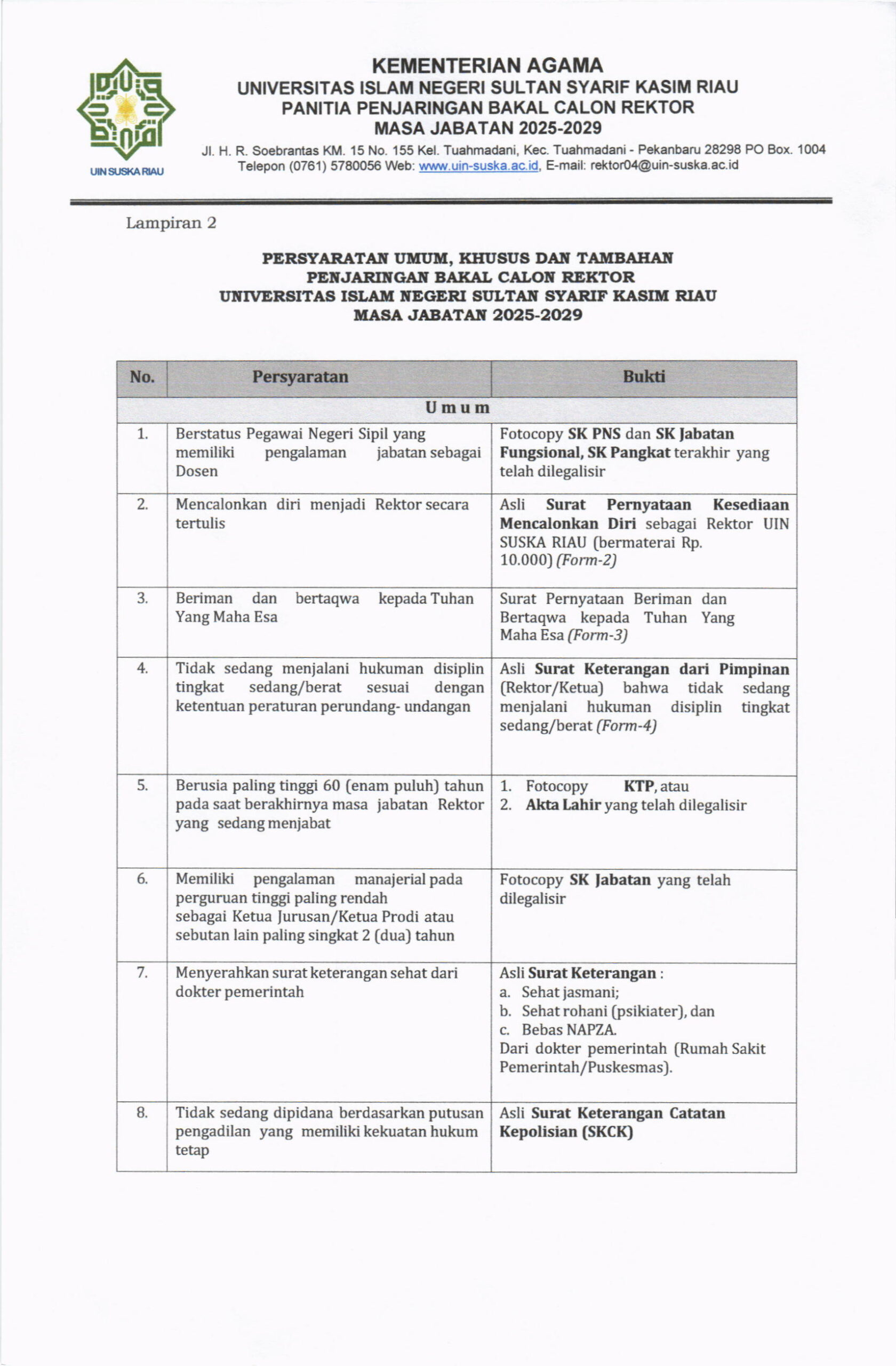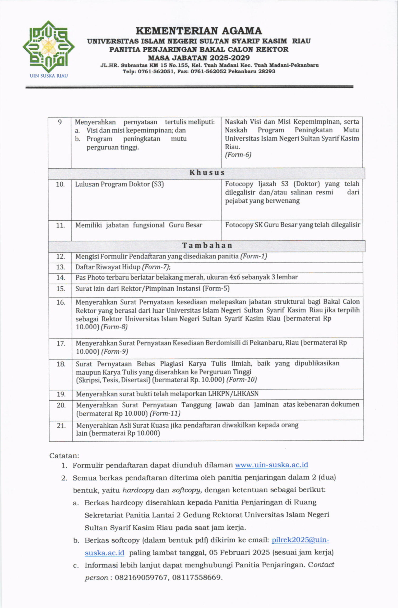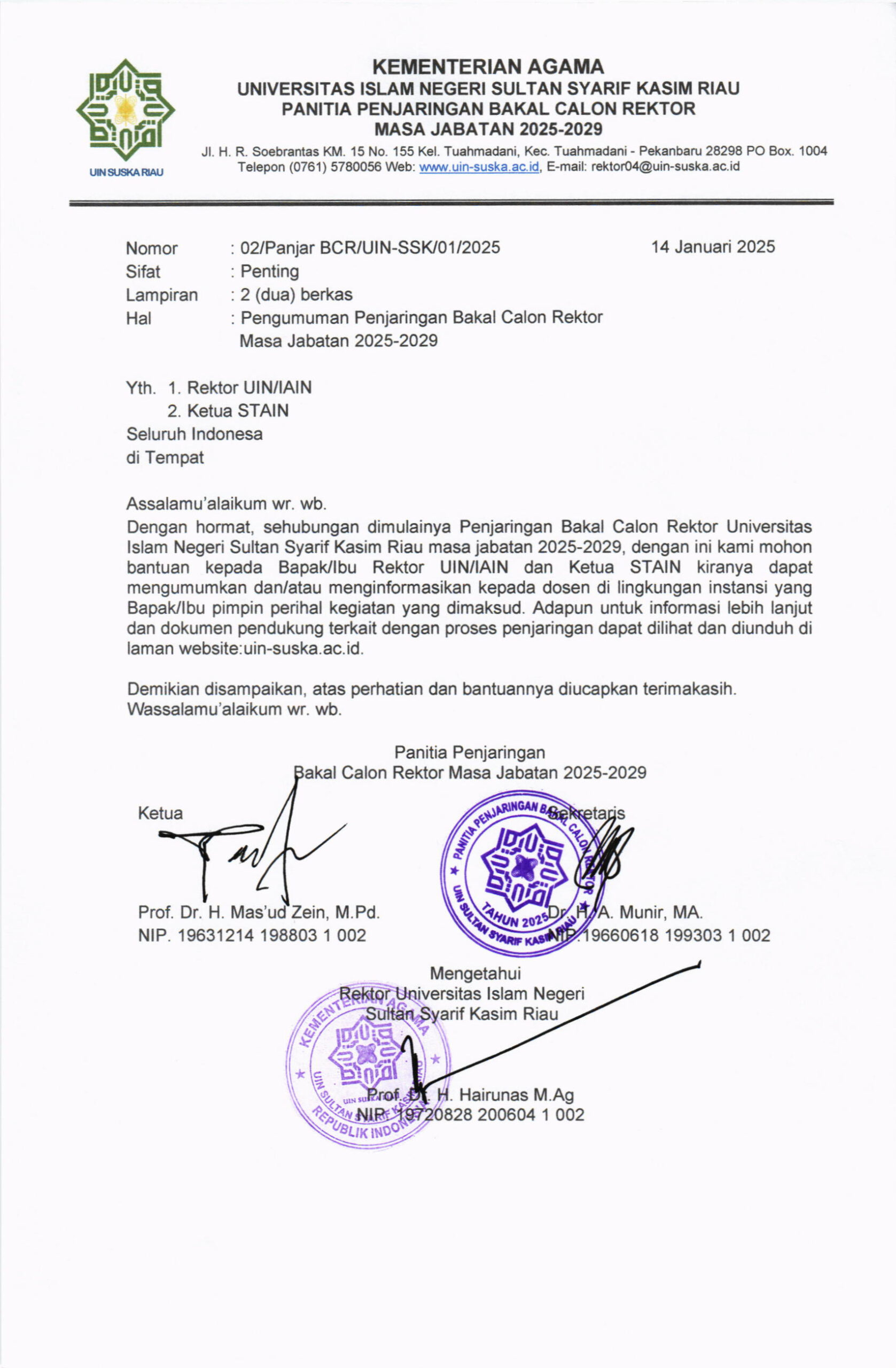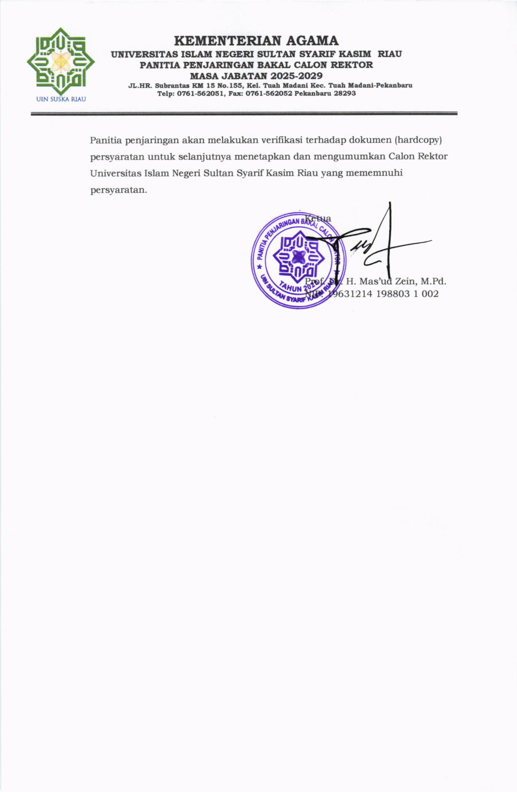 Pengumuman Penjaringan Bakal Calon Rektor UIN Suska Riau Masa Jabatan 2025-2029