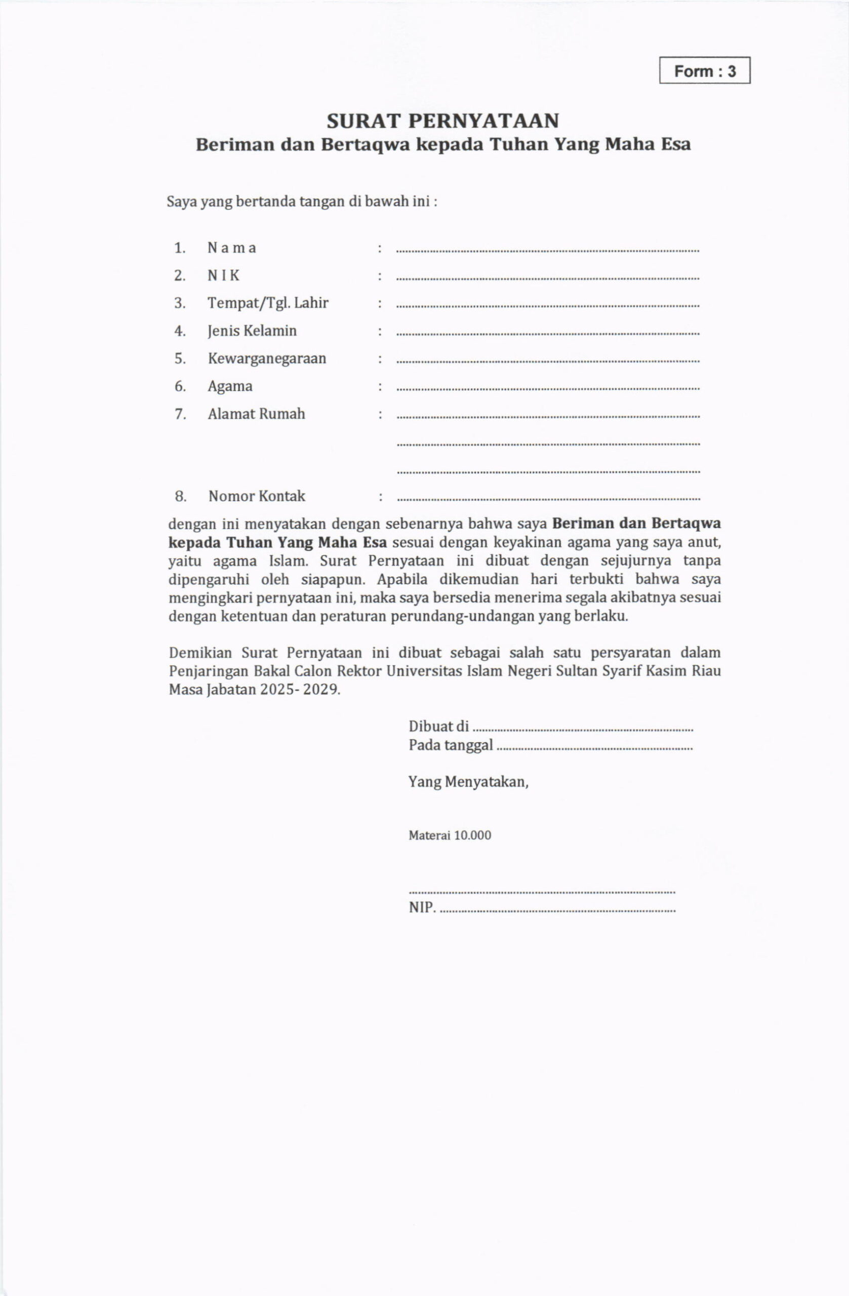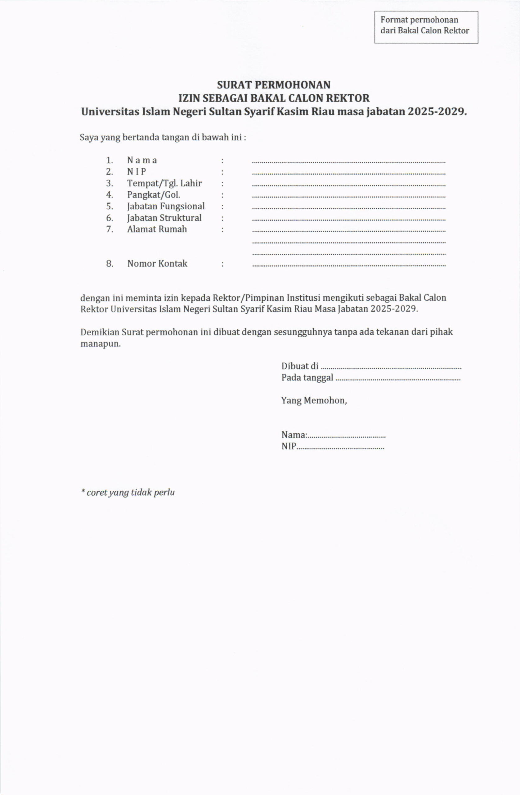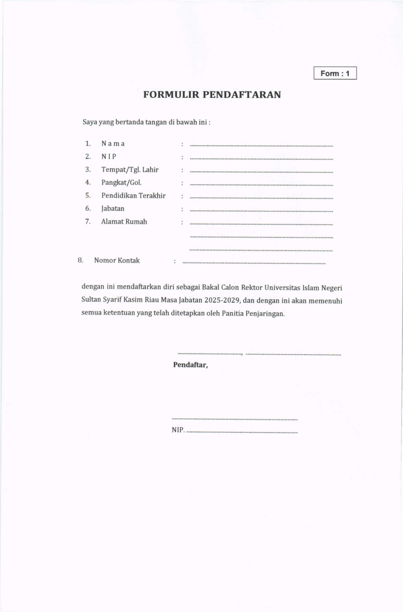 Pengumuman Penjaringan Bakal Calon Rektor UIN Suska Riau Masa Jabatan 2025-2029