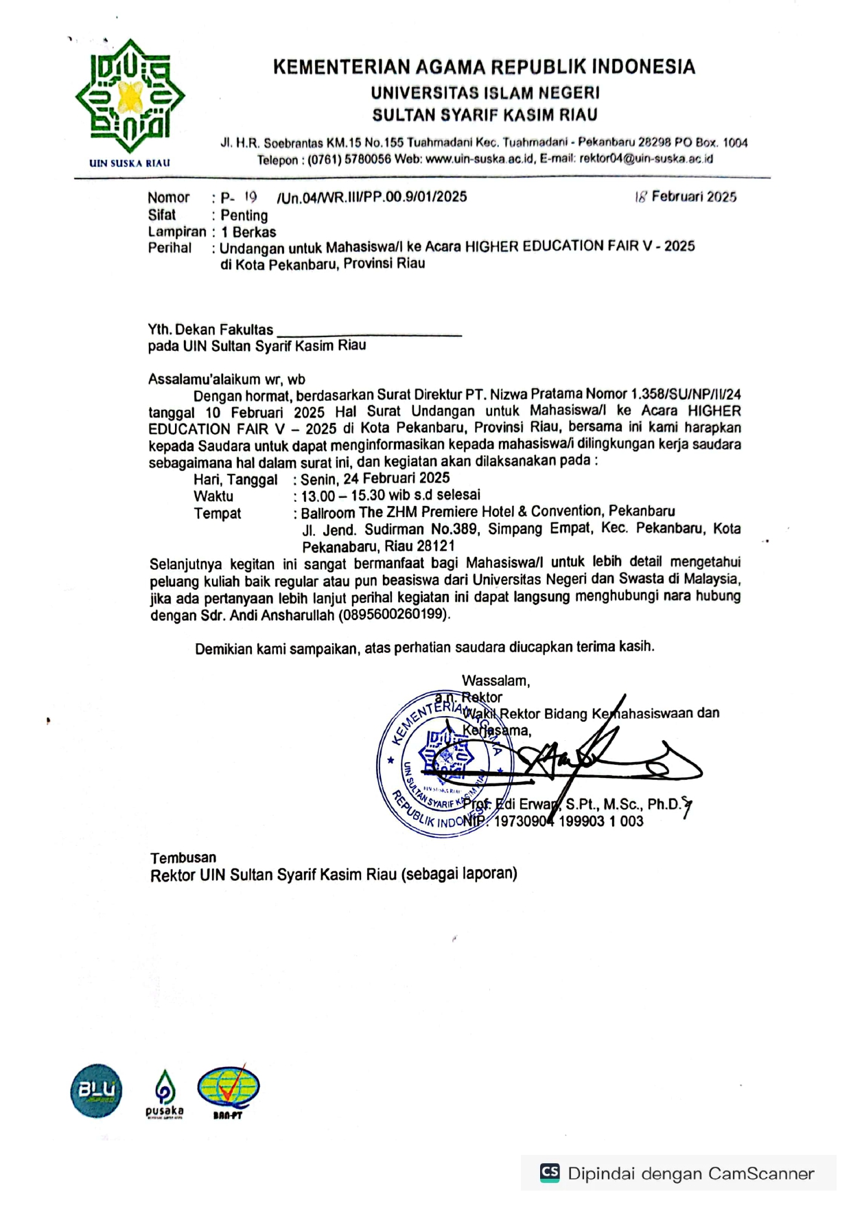 Undangan untuk Mahasiswa/I ke Acara HIGHER EDUCATION FAIR V 2025 di Kota Pekanbaru Provinsi Riau