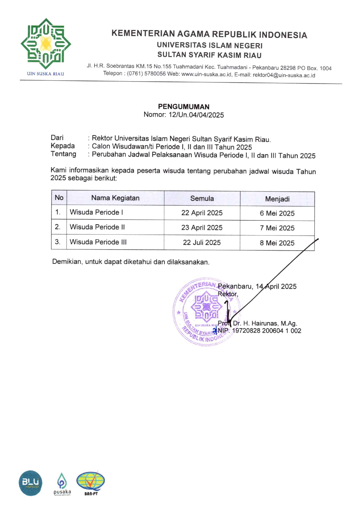 Perubahan Jadwal Pelaksanaan Wisuda Periode I, II dan III Tahun 2025