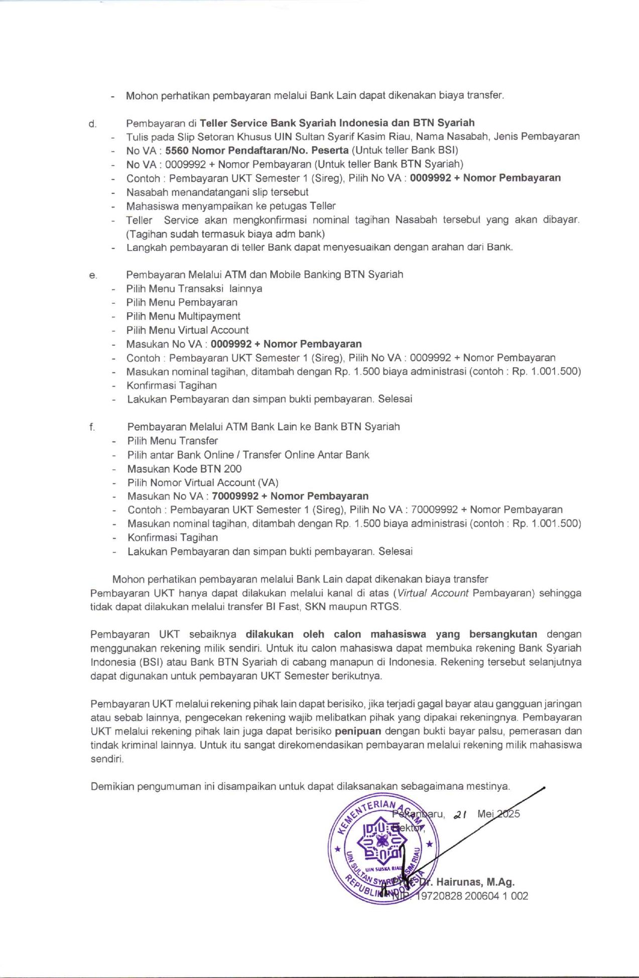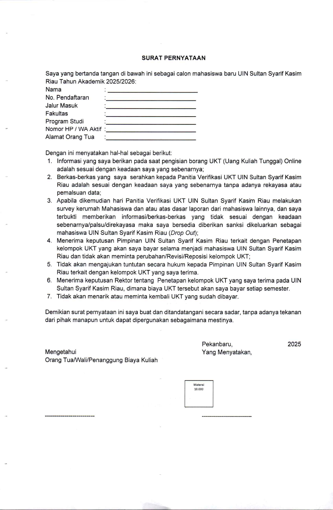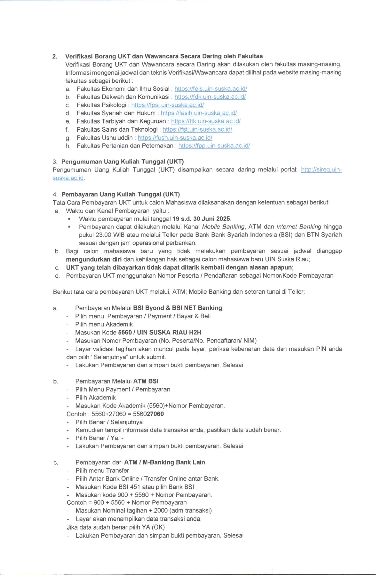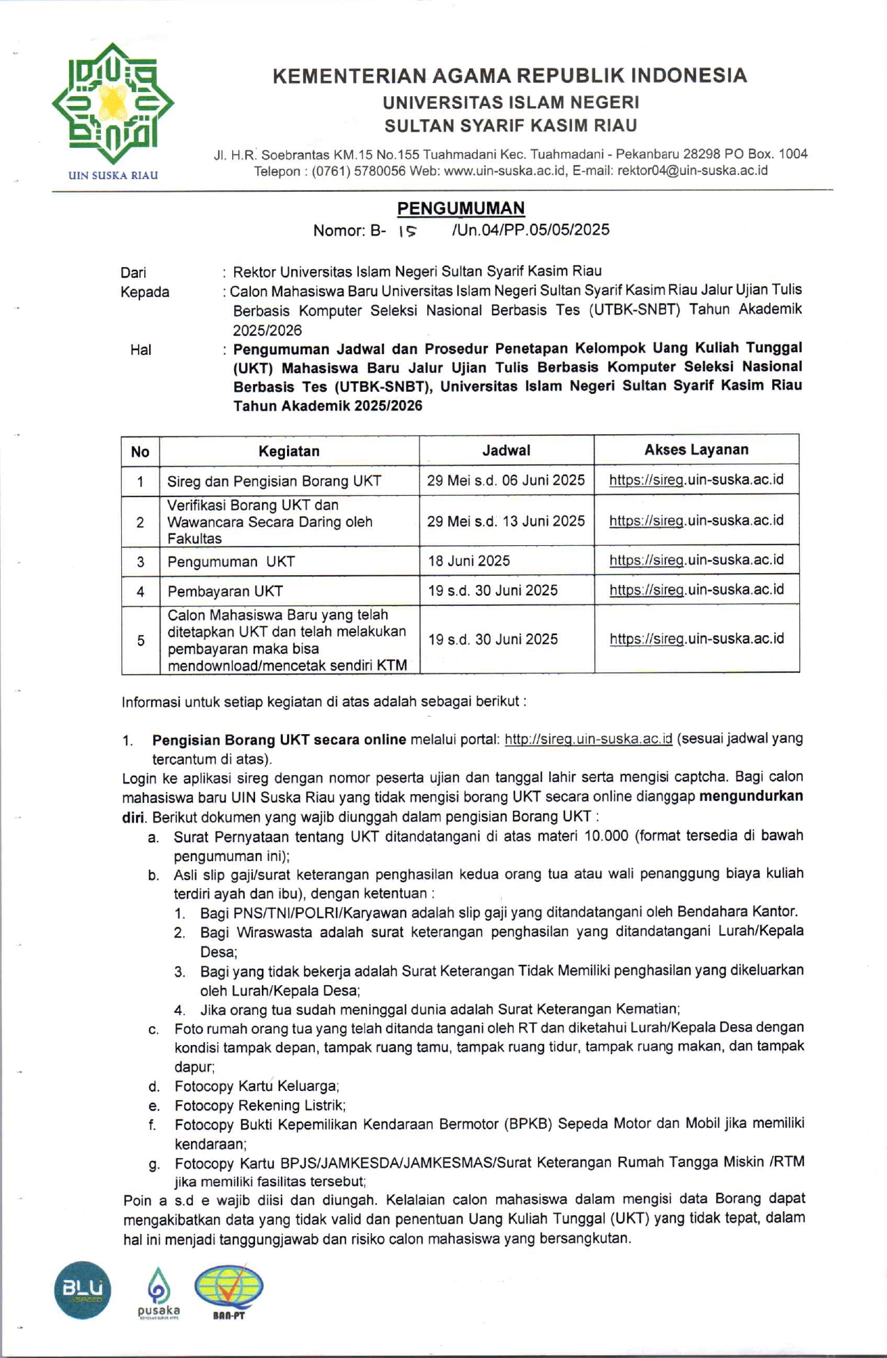 Pengumuman Jadwal dan Prosedur Penetapan Kelompok Uang Kuliah Tunggal (UKT) Mahasiswa Baru Jalur Ujian Tulis Berbasis Komputer Seleksi Nasional Berbasis Tes (UTBK-SNBP) Universitas Islam Negeri Sultan Syarif Kasim Riau Tahun Akademik 2025 / 2026