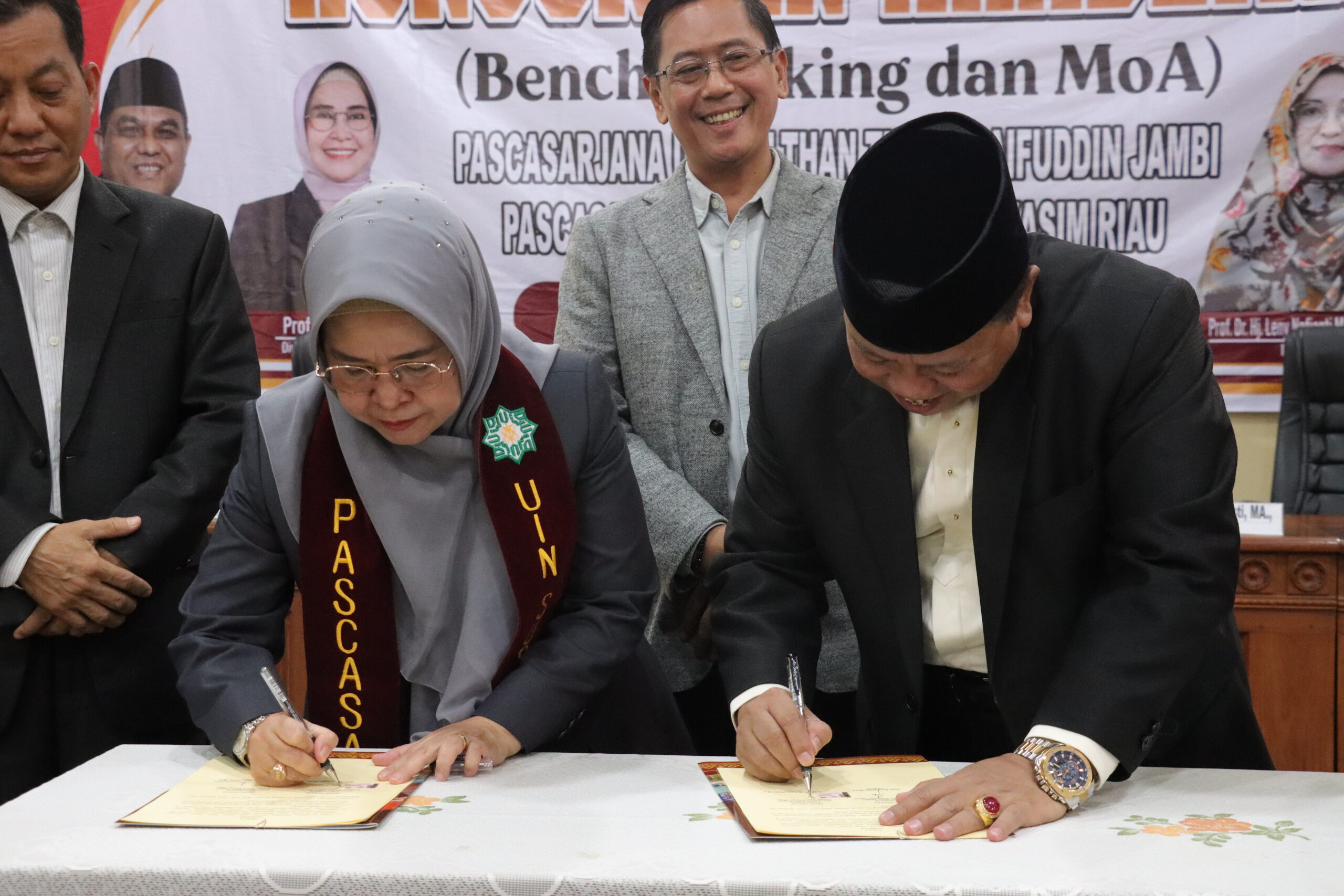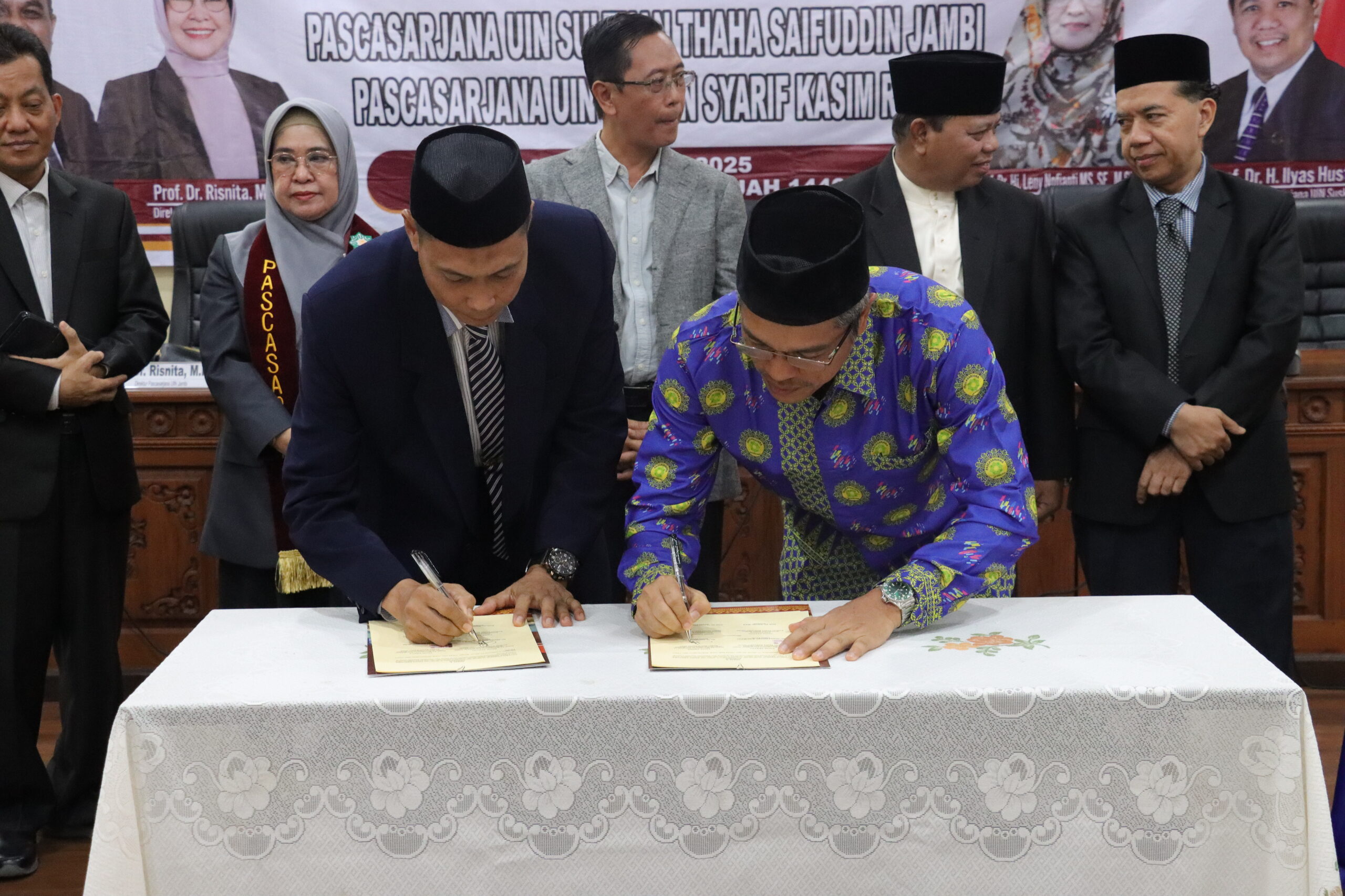 Acara penting ini dihadiri langsung oleh Direktur Pascasarjana UIN Suska Riau, Prof. Dr. H. Ilyas Husti, MA, dan Direktur Pascasarjana UIN Sulthan Thaha Saifuddin Jambi, Prof. Dr. Risnita, M.Pd. Turut hadir dalam kegiatan tersebut Wakil Direktur Pascasarjana UIN Jambi serta jajaran dosen dan staf dari kedua institusi.