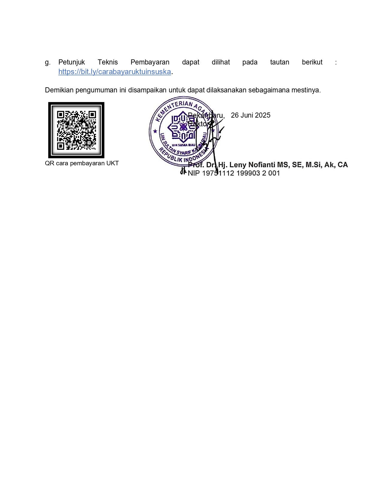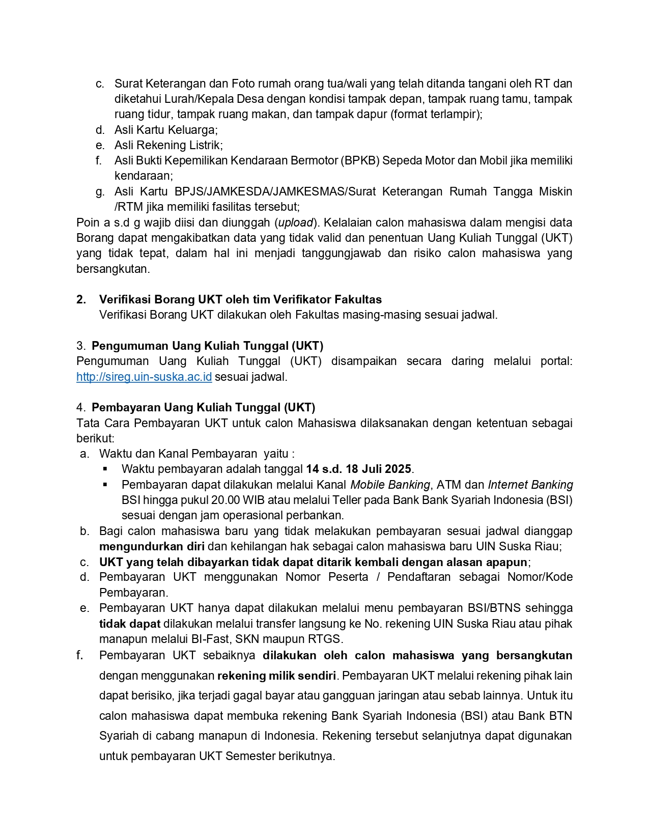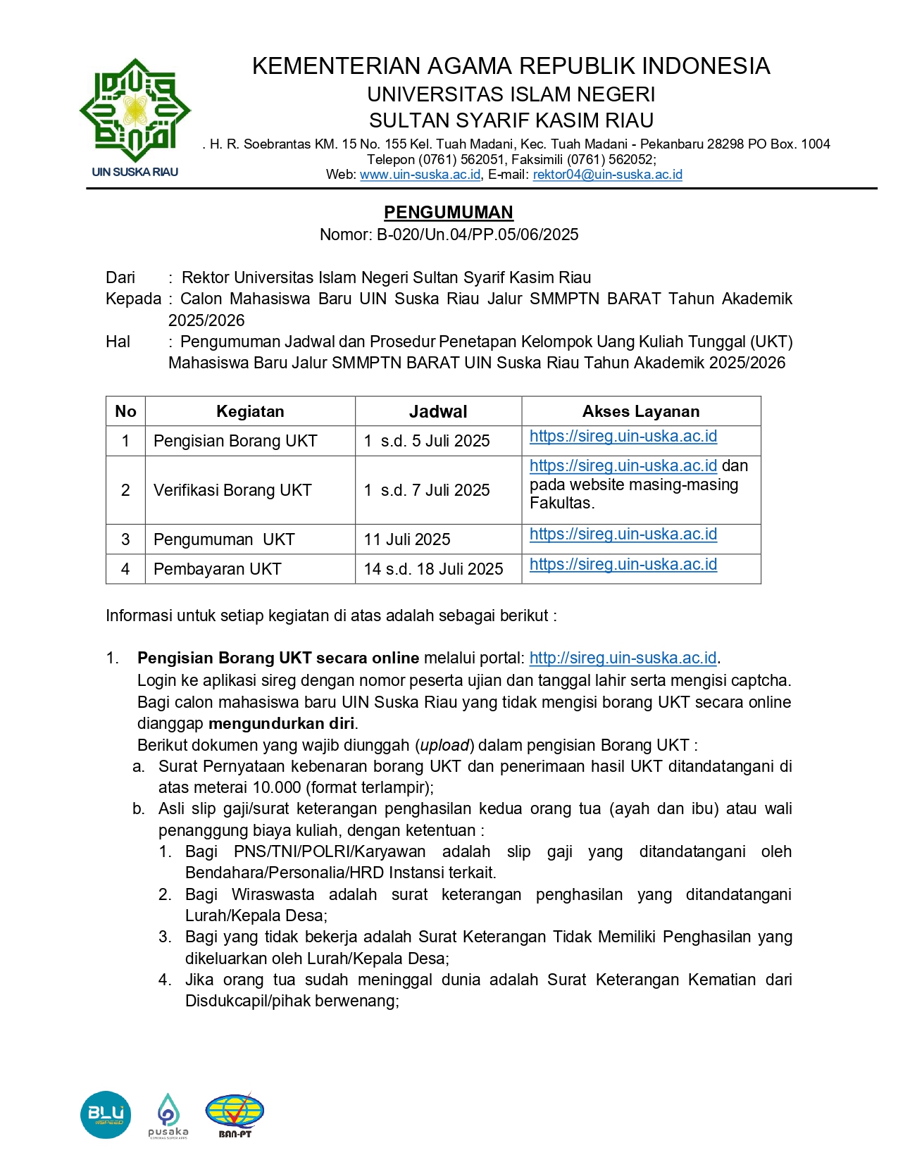 Pengumuman Jadwal dan Prosedur Penetapan Kelompok Uang Kuliah Tunggal (UKT) Mahasiswa Baru Jalur SMMPTN BARAT UIN SUSKA Riau Tahun Akademik 2025/2026