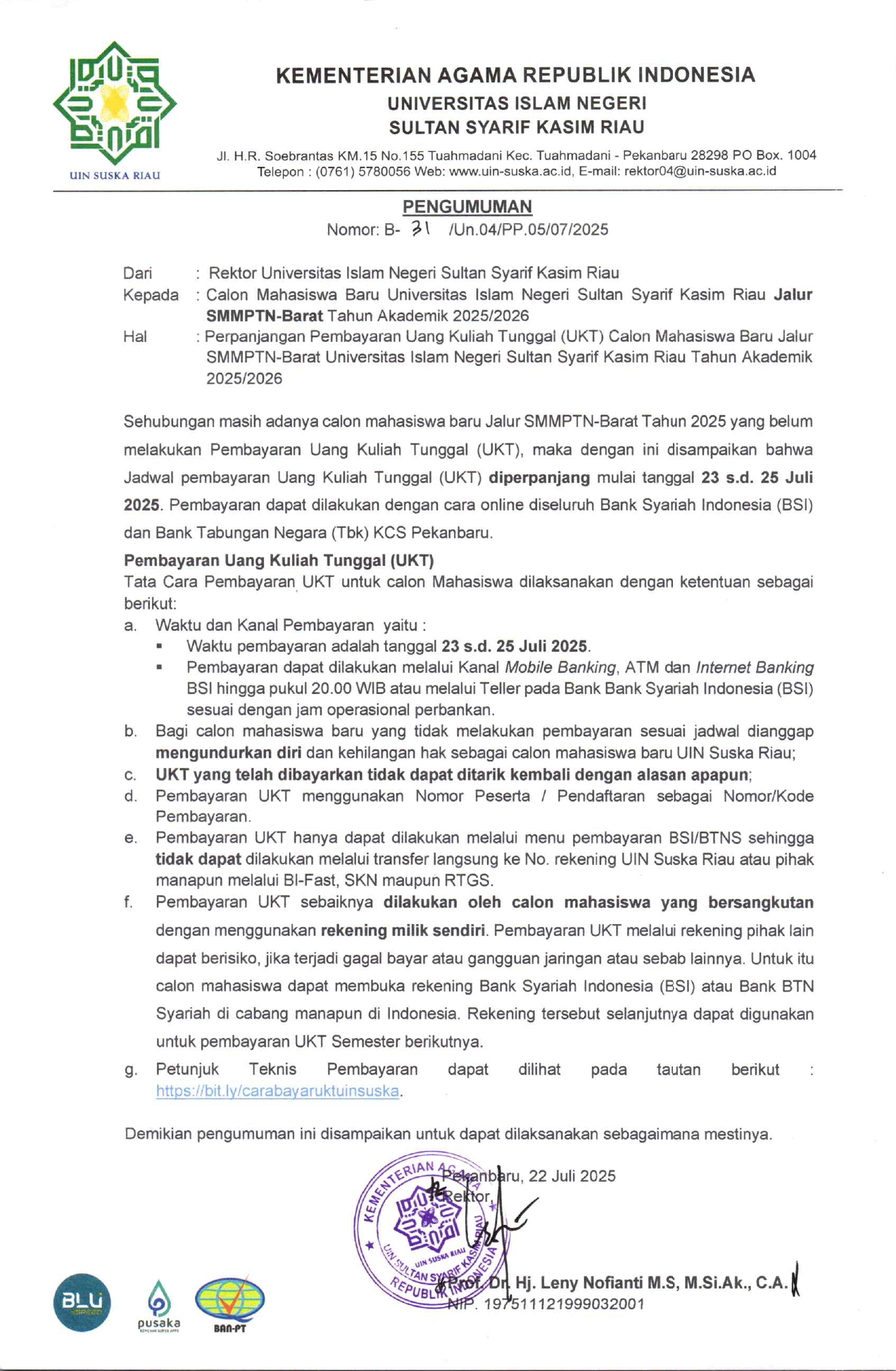 Perpanjangan Pembayaran Uang Kuliah Tunggal (UKT) Calon Mahasiswa Baru Jalur SMMPTN-Barat UIN Sultan Syarif Kasim Riau Tahun Akademik 2025/2026