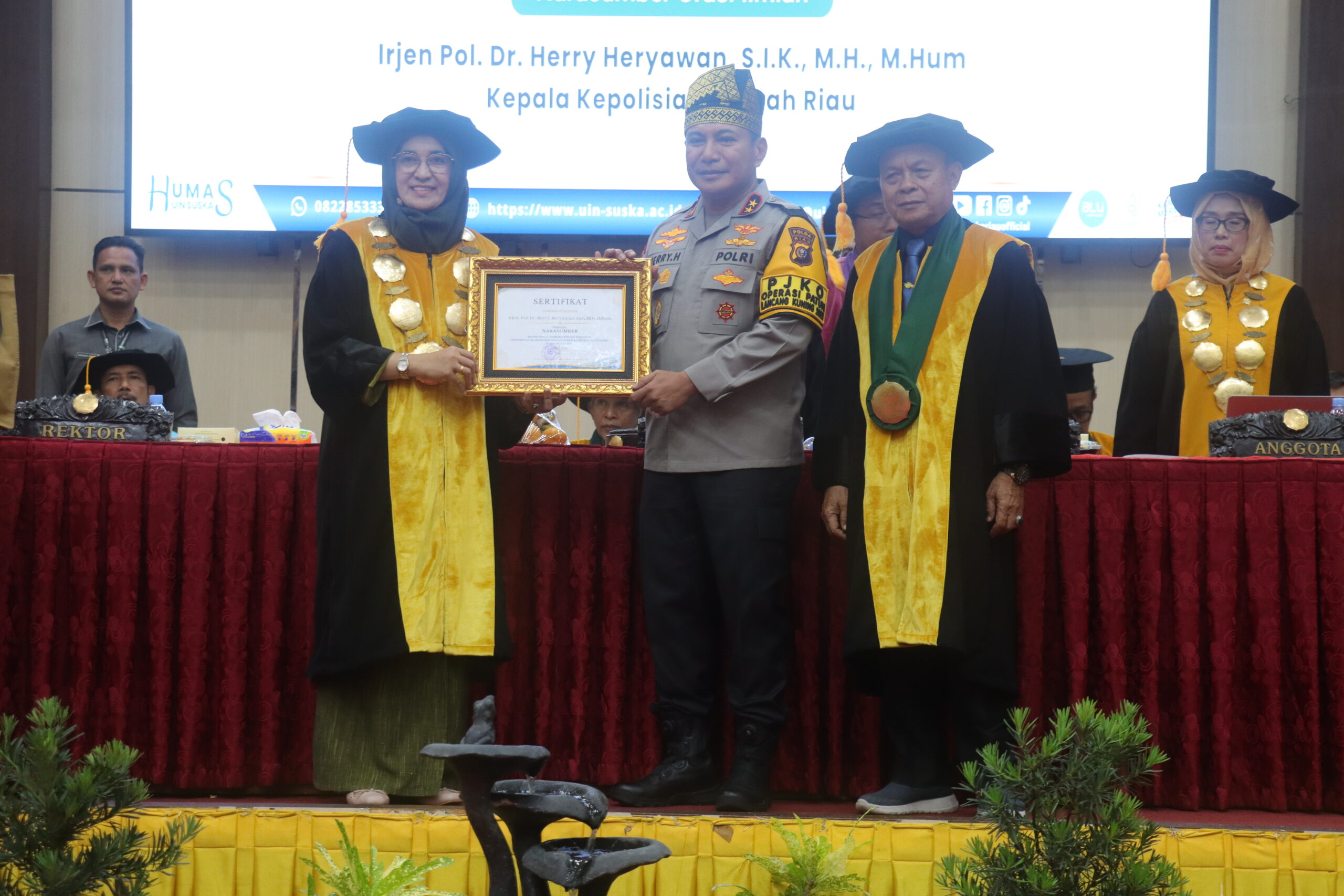 Sebagai bentuk apresiasi, Rektor UIN Suska Riau, Prof. Dr. Hj. Leny Nofianti, secara resmi menyerahkan plakat penghargaan kepada Kapolda Riau, Irjen. Pol. Dr. Herry Heryawan, S.IK, M.H. Penghargaan tersebut diberikan atas kontribusi intelektual beliau dalam menyampaikan orasi ilmiah yang sarat nilai, serta komitmennya dalam mendorong kesadaran kolektif terhadap pentingnya pelestarian lingkungan dan peran strategis dunia pendidikan dalam membangun masa depan yang berkelanjutan.