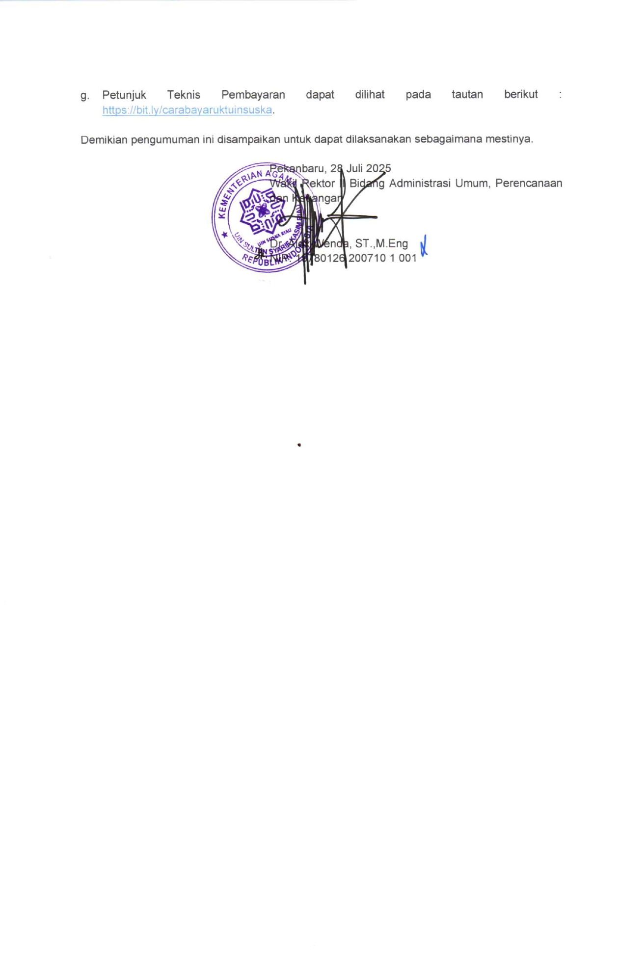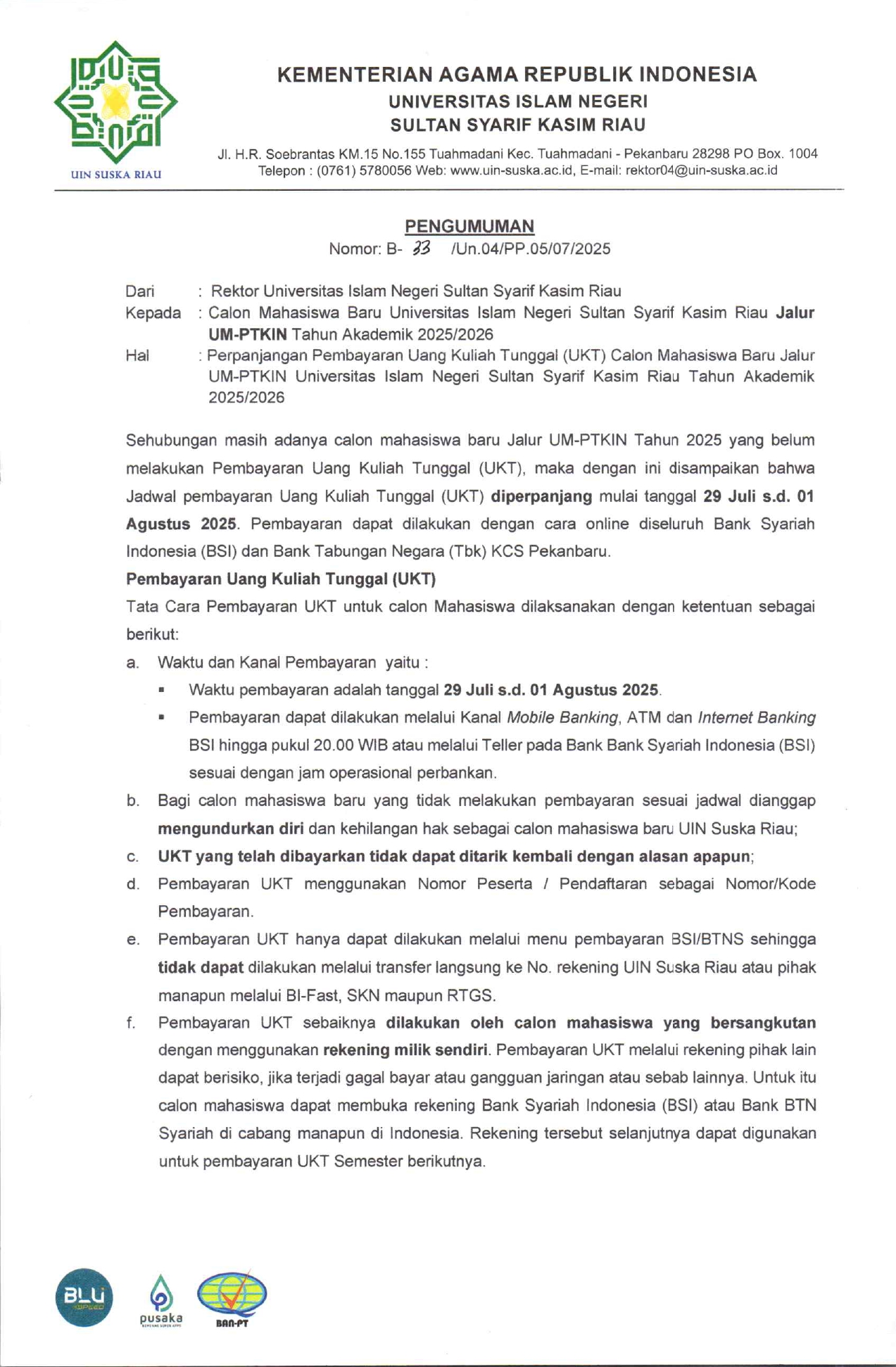 Perpanjangan Pembayaran Uang Kuliah Tunggal (UKT) Calon Mahasiswa Baru Jalur UM-PTKIN UIN Sultan Syarif Kasim Riau T.A 2025/2026