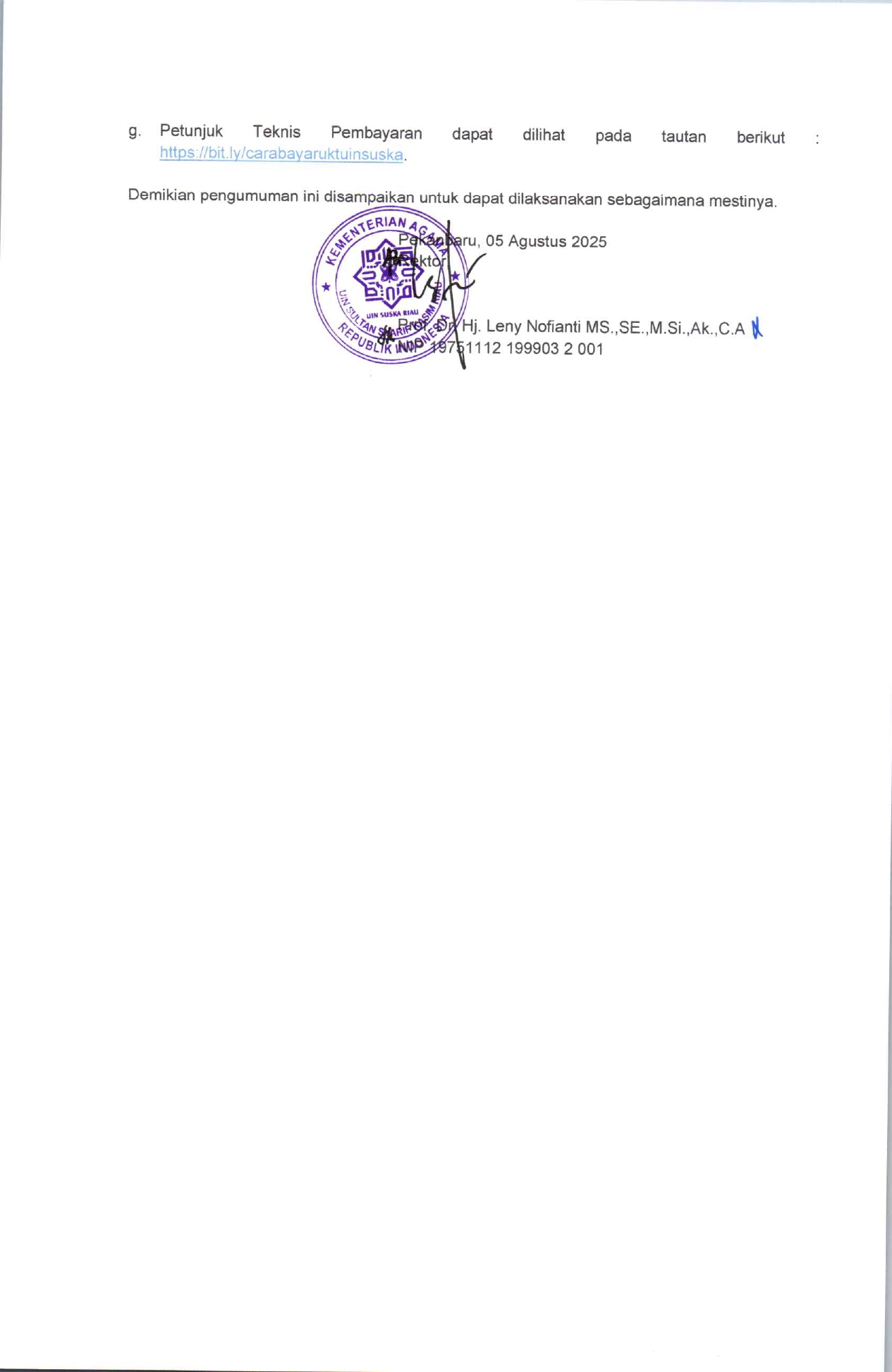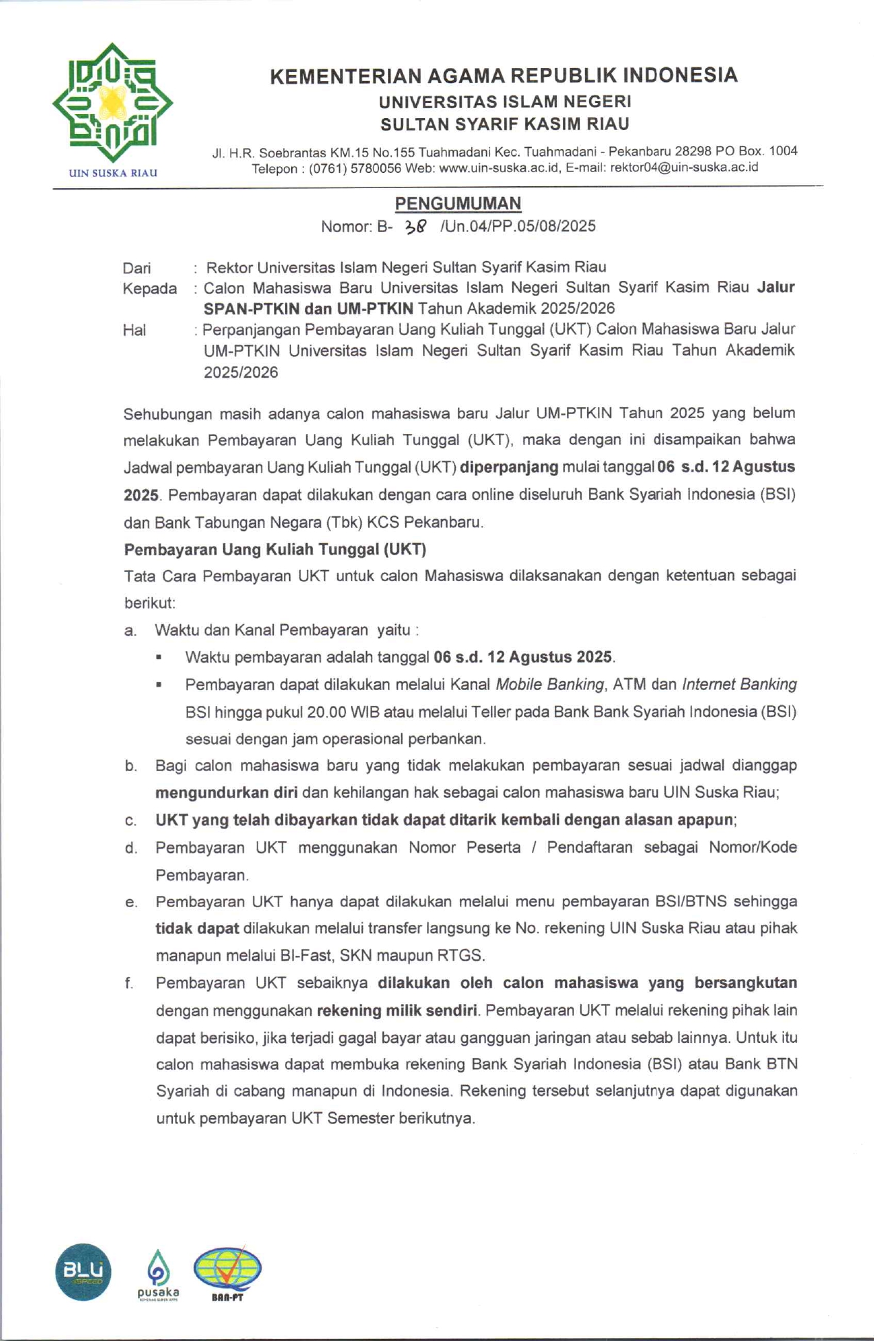 Perpanjangan pembayaran uang kuliah tunggal (UKT) calon mahasiswa baru jalur UM-PTKIN UIN Sultan Syarif Kasim Riau tahun akademik 2025/2026.