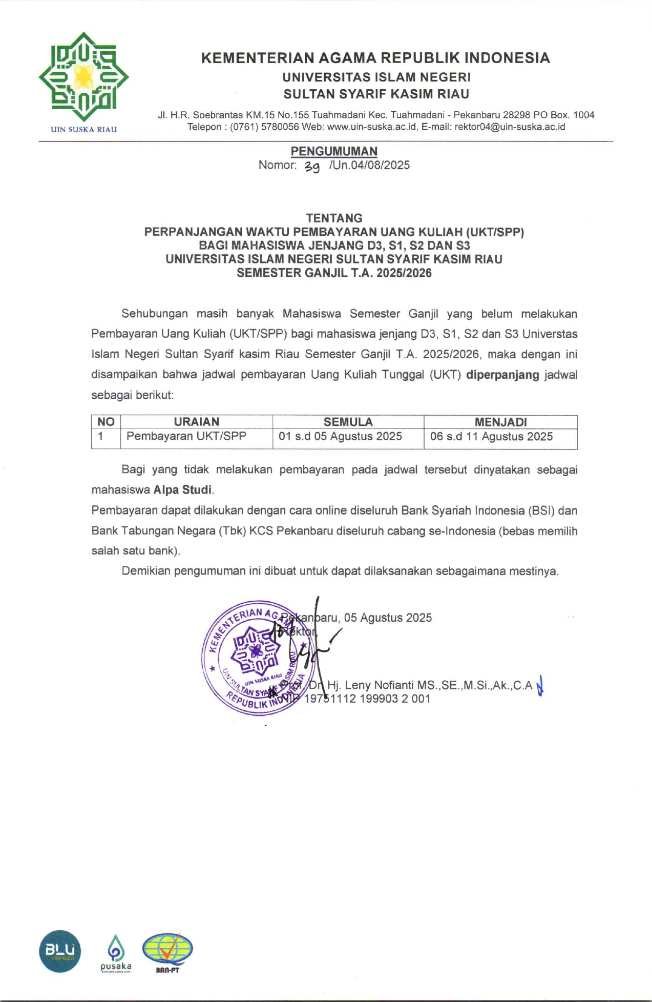 Perpanjangan waktu pembayaran uang kuliah tunggal (UKT/SPP) bagi mahasiswa jenjang D3,S1,S2 dan S3 UIN Sultan Syarif Kasim Riau semester ganjil T.A. 2025/2026