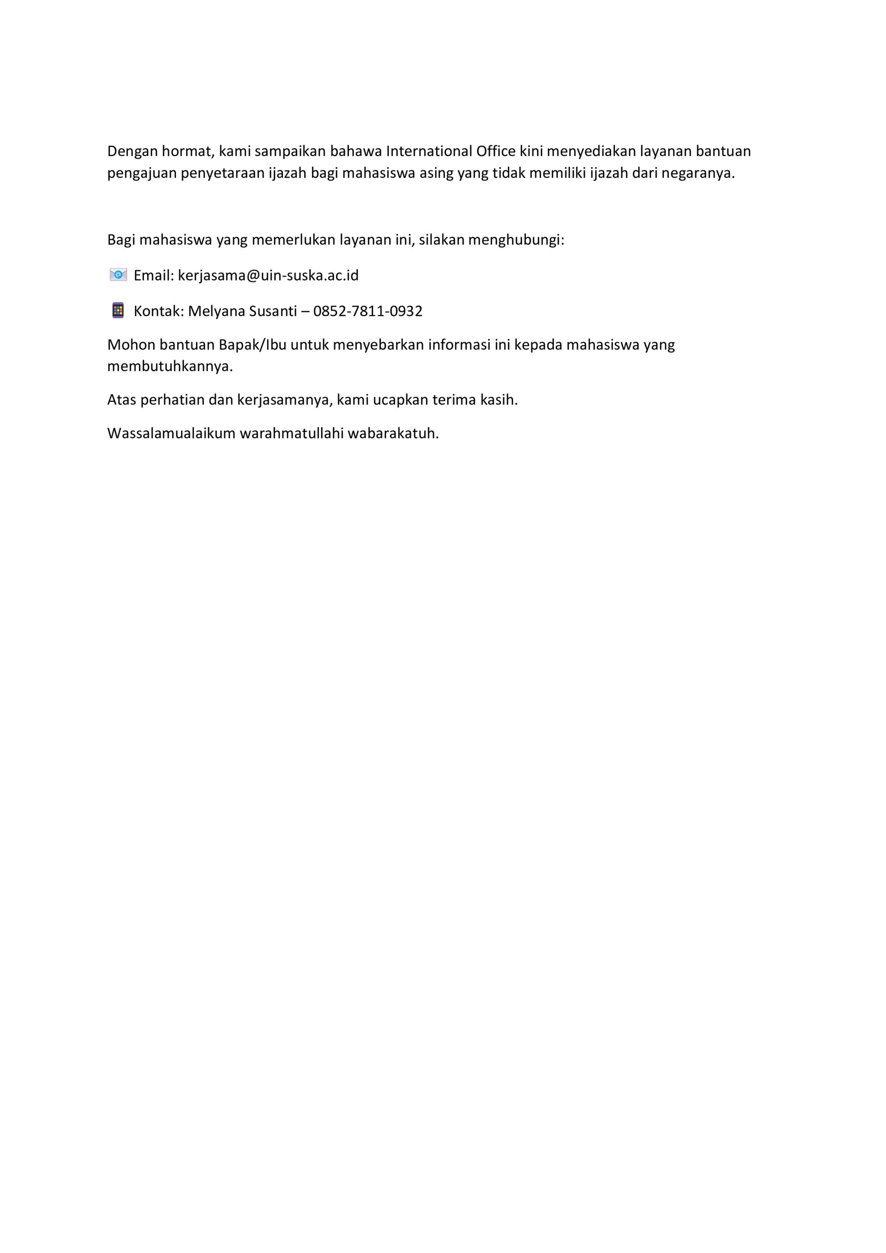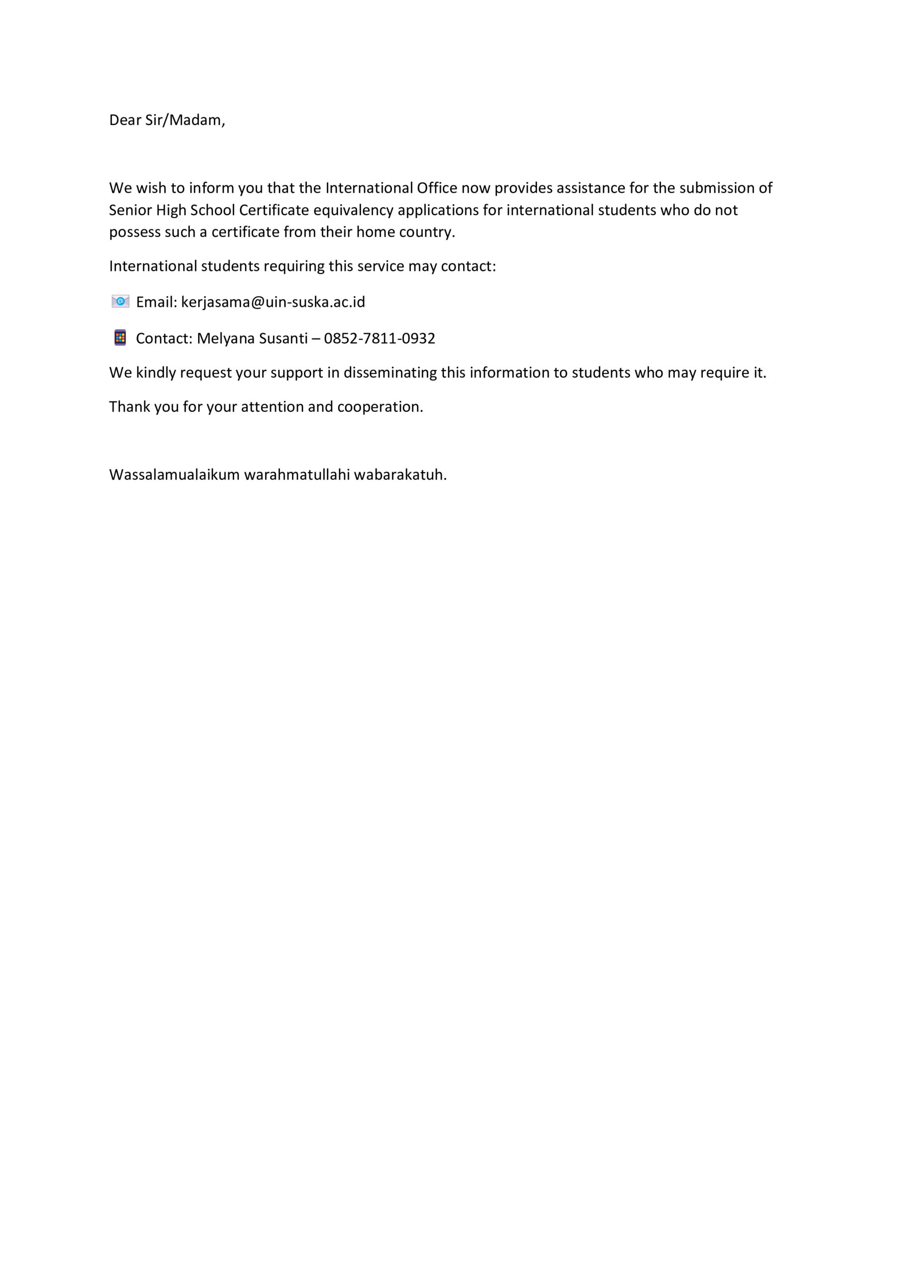 Pengumuman Layanan Bantuan Pengajuan Penyetaraan Ijazah bagi Mahasiswa Asing yang Tidak Memiliki Ijazah dari Negaranya