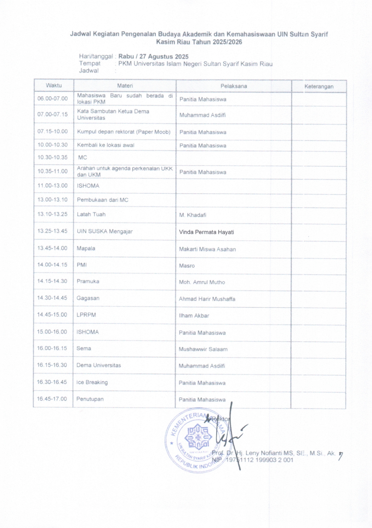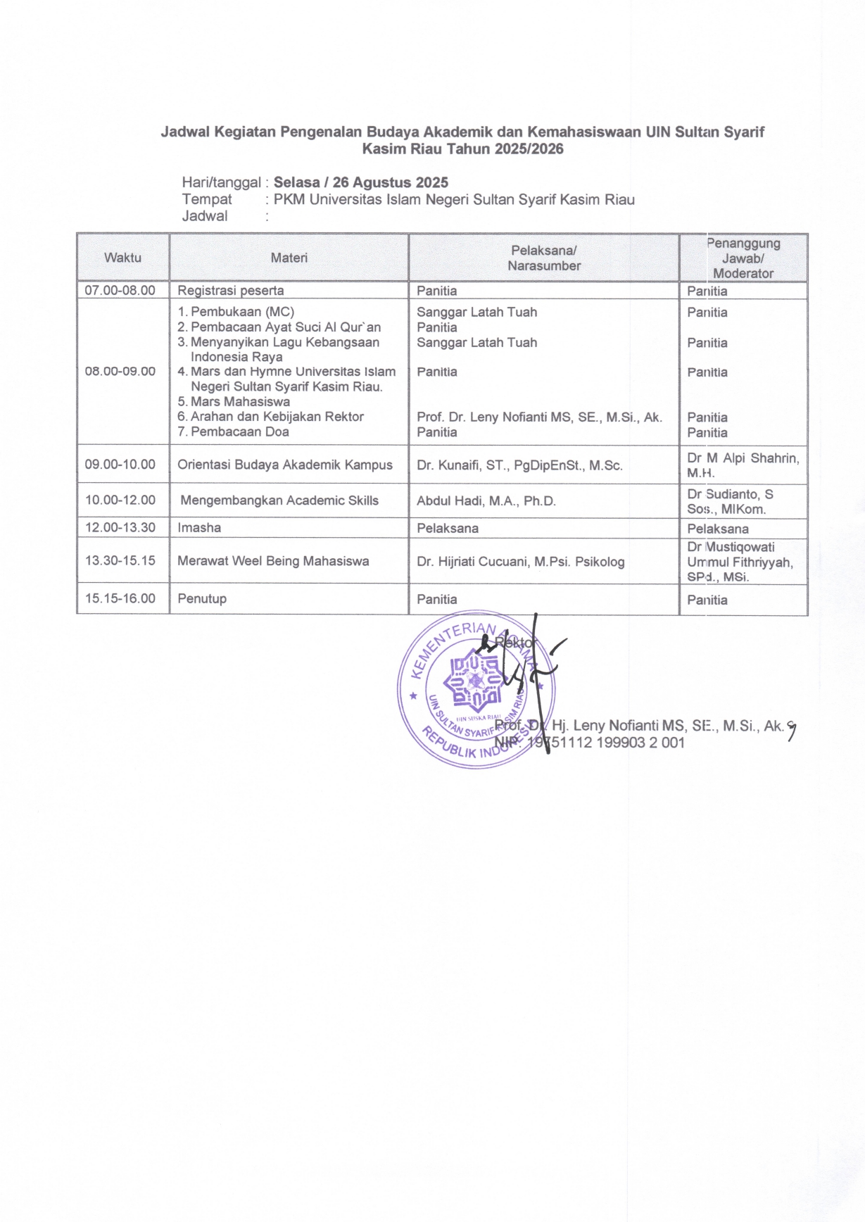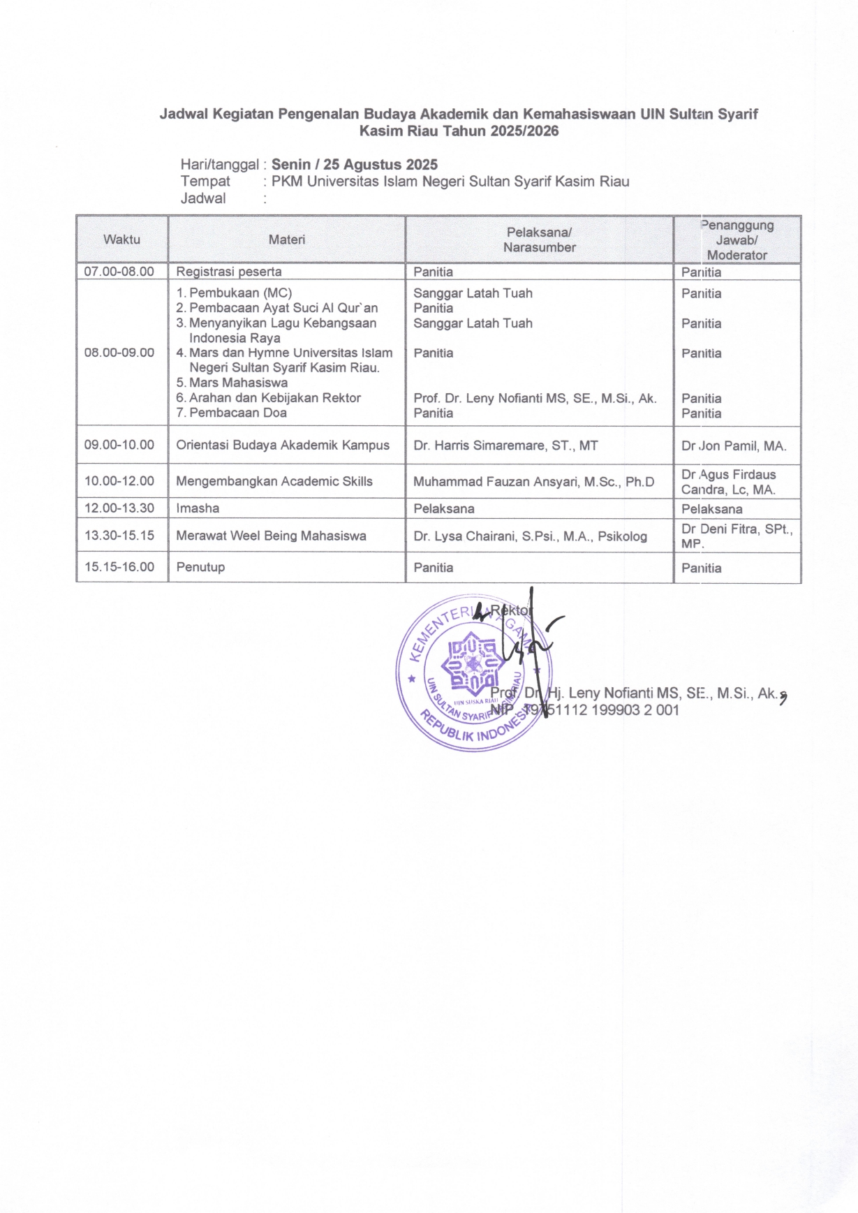 Pengenalan Budaya Akademik dan Kemahasiswaan (PBAK) Mahasiswa Universitas Islam Negeri Sultan Syarif Kasim Riau Tahun 2025