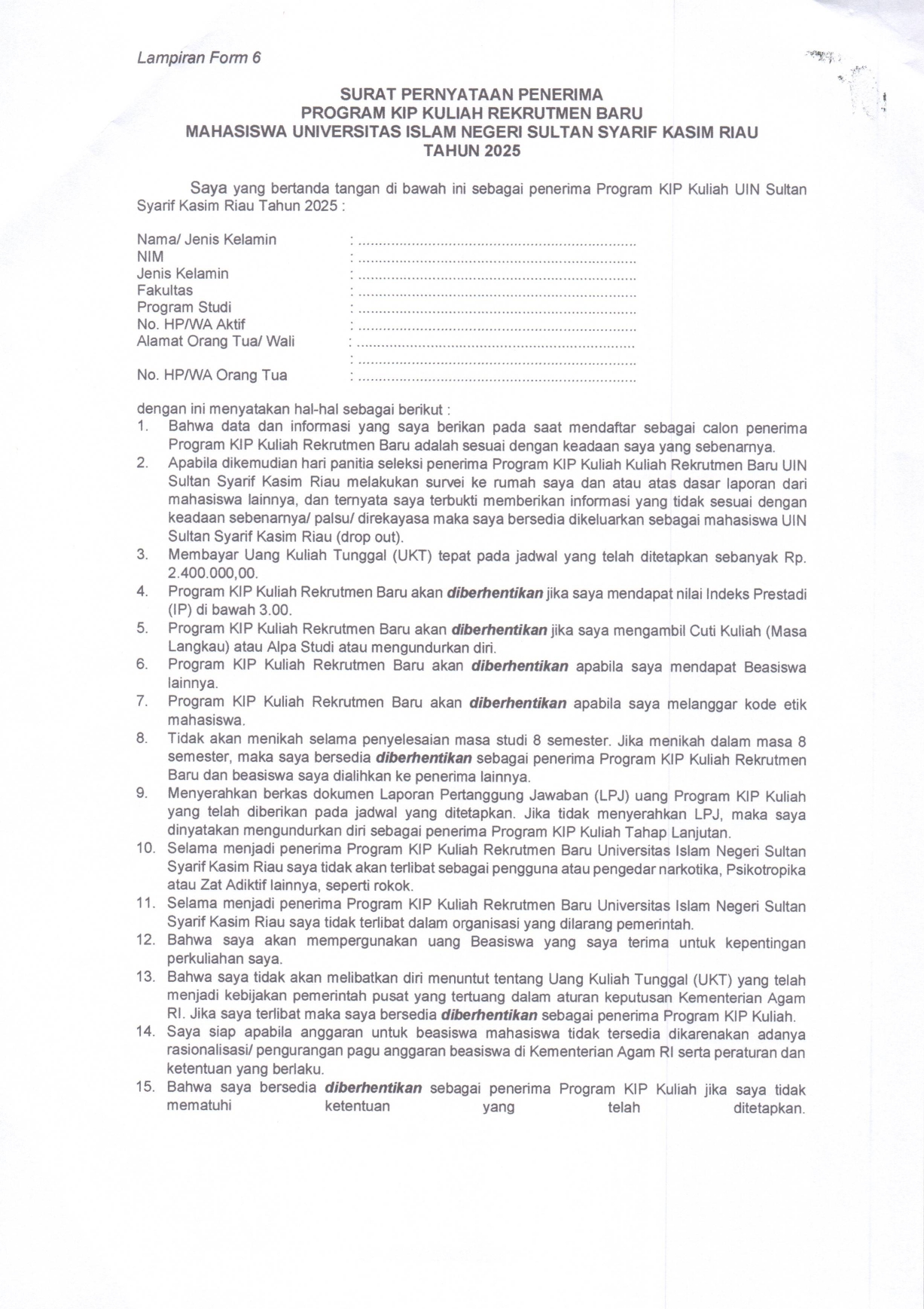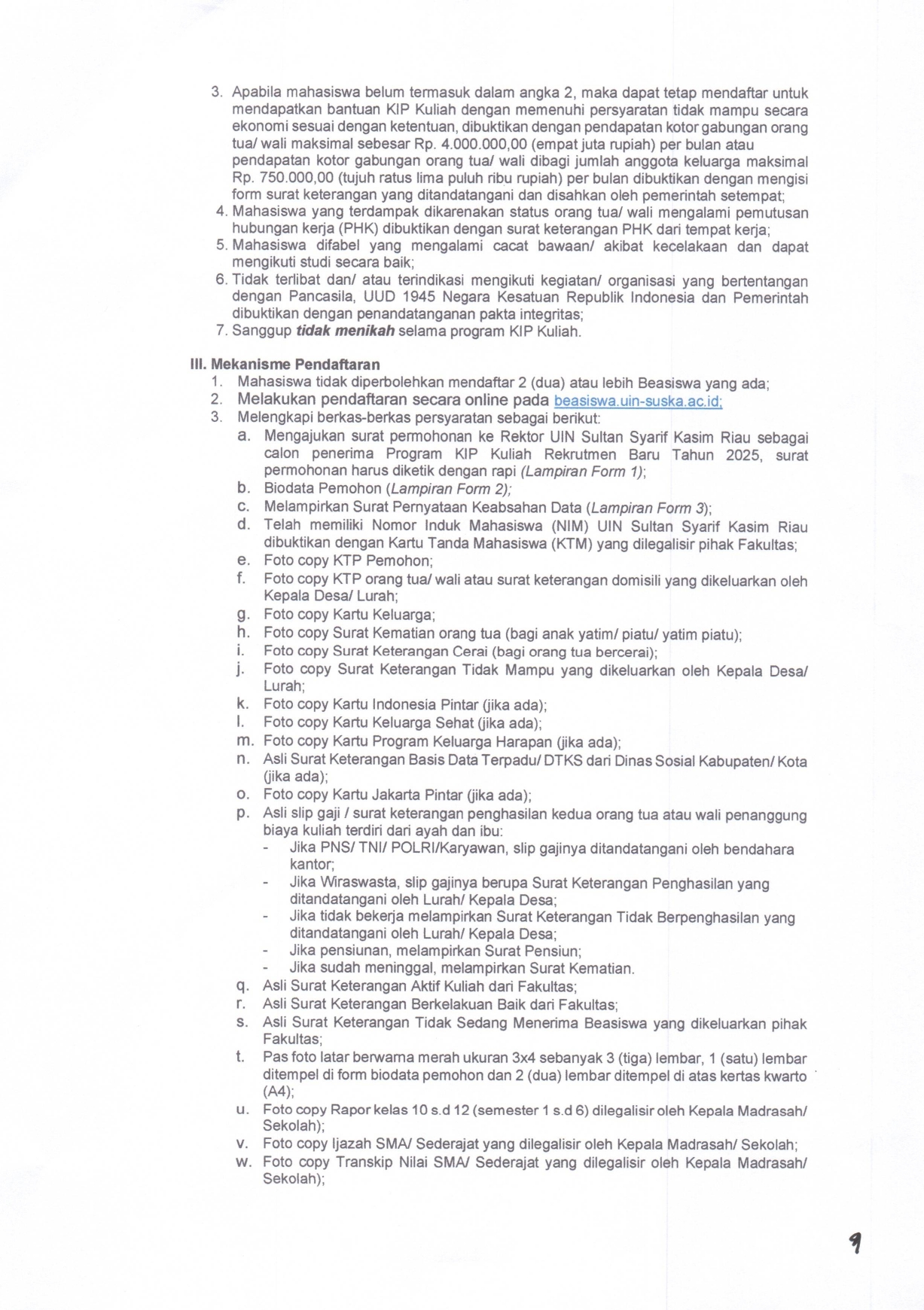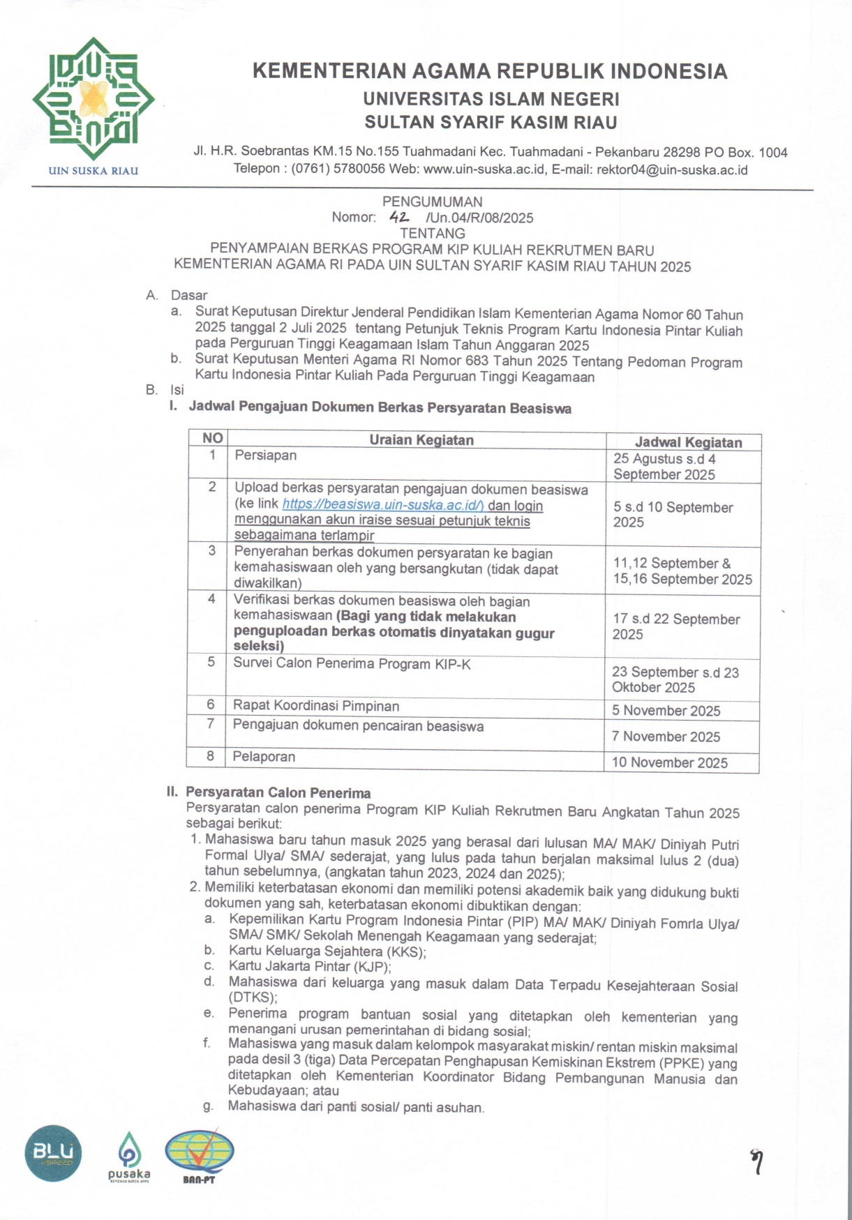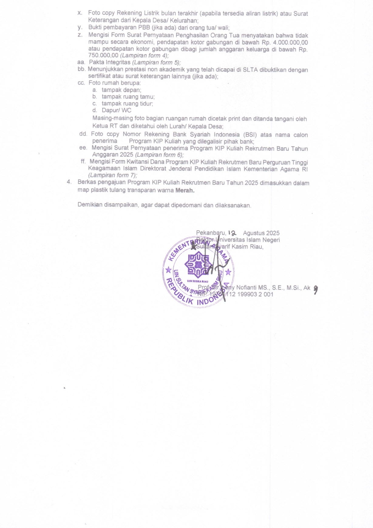 Penyampaian Berkas Program KIP Kuliah Rekrutmen Baru Kementerian Agama RI pada UIN Sultan Syarif Kasim Riau Tahun 2025