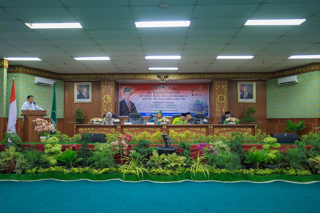 uin-suska.ac.id Menteri Agama Republik Indonesia, Prof. Dr. KH. Nasaruddin Umar, MA melakukan kunjungan kerja ke Universitas Islam Negeri Sultan Syarif Kasim (UIN Suska) Riau, Kamis (18/9/2025), bertempat di Ruang Auditorium Gedung Rektorat Lantai 5.