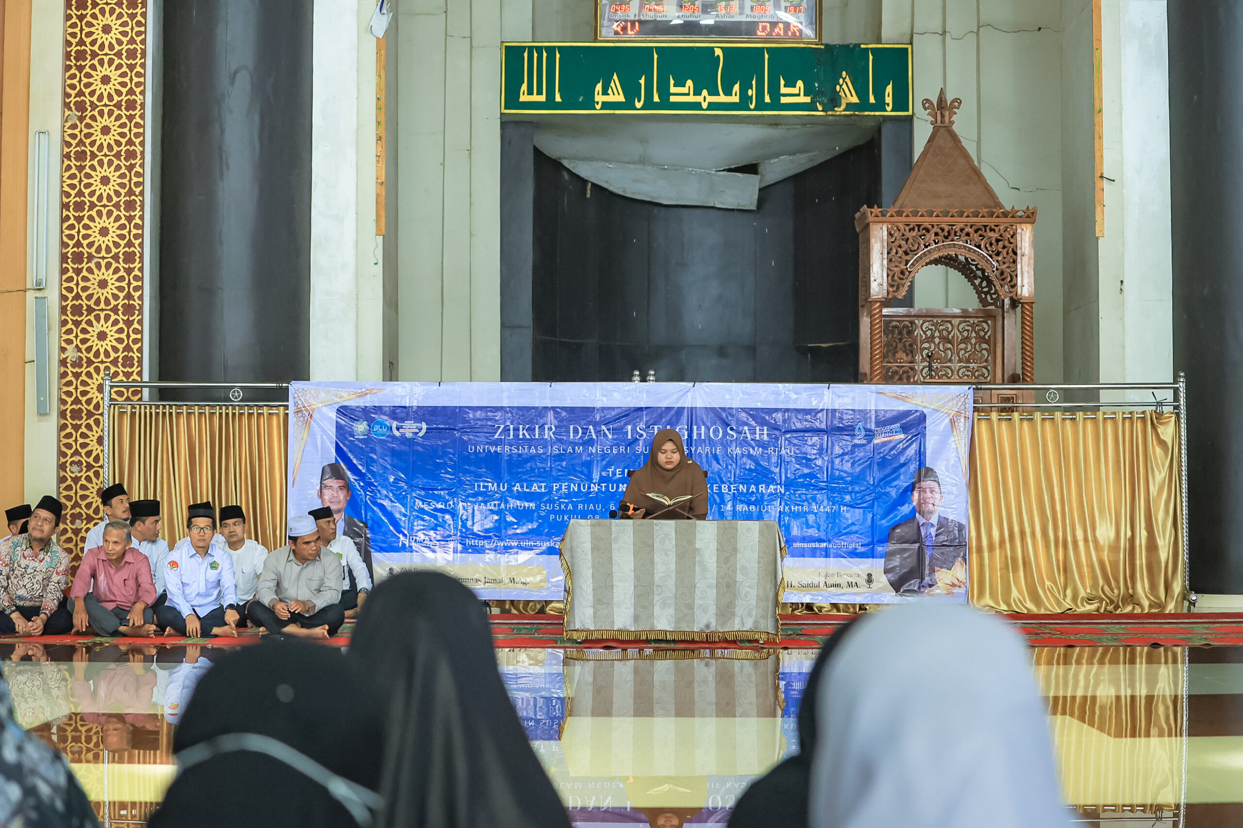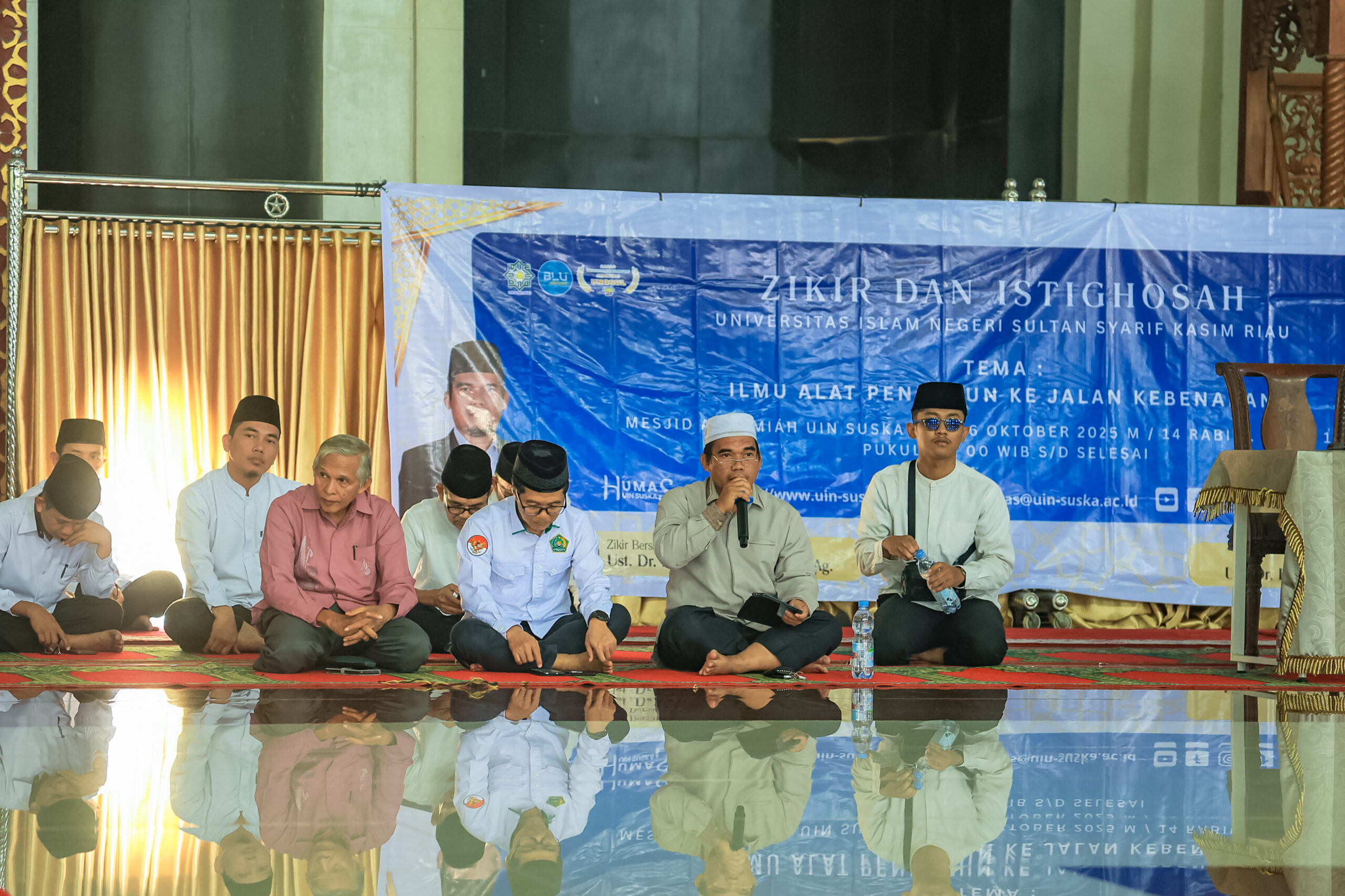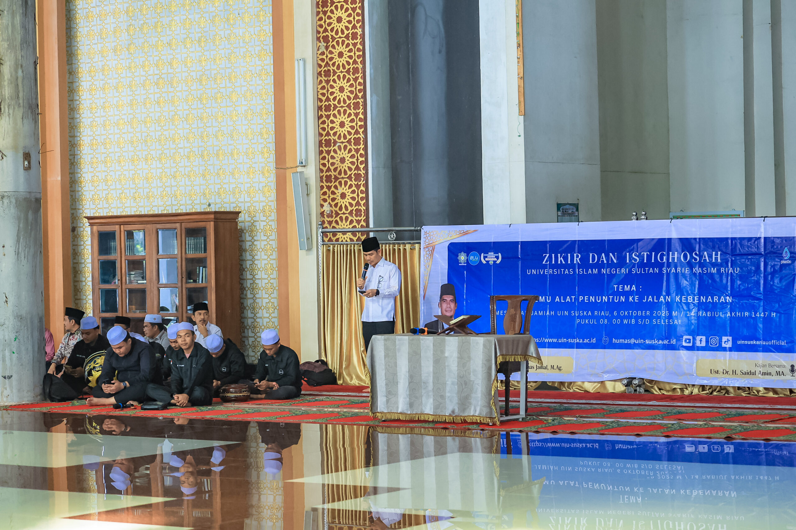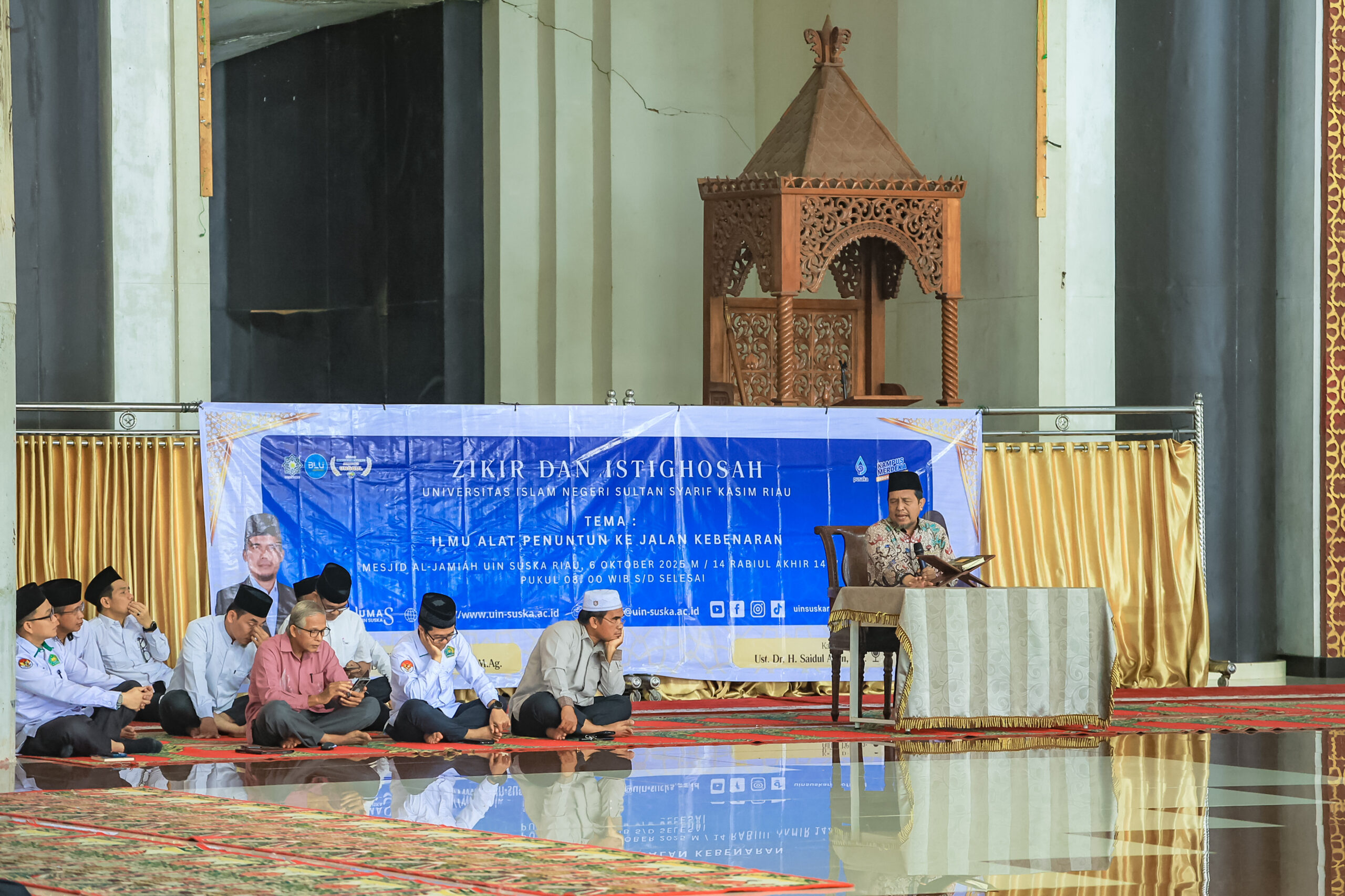 uin-suska.ac.id Universitas Islam Negeri Sultan Syarif Kasim Riau menggelar kegiatan rutin bulanan penuh makna, yaitu Kajian Ilmiah Zikir & Istighosah, yang dilaksanakan di Masjid Al Jamia’ah UIN Suska Riau. Tema yang diangkat kali ini sangat penting, yakni “Ilmu: Alat Penuntun ke Jalan Kebenaran” Senin (06/10/2025).