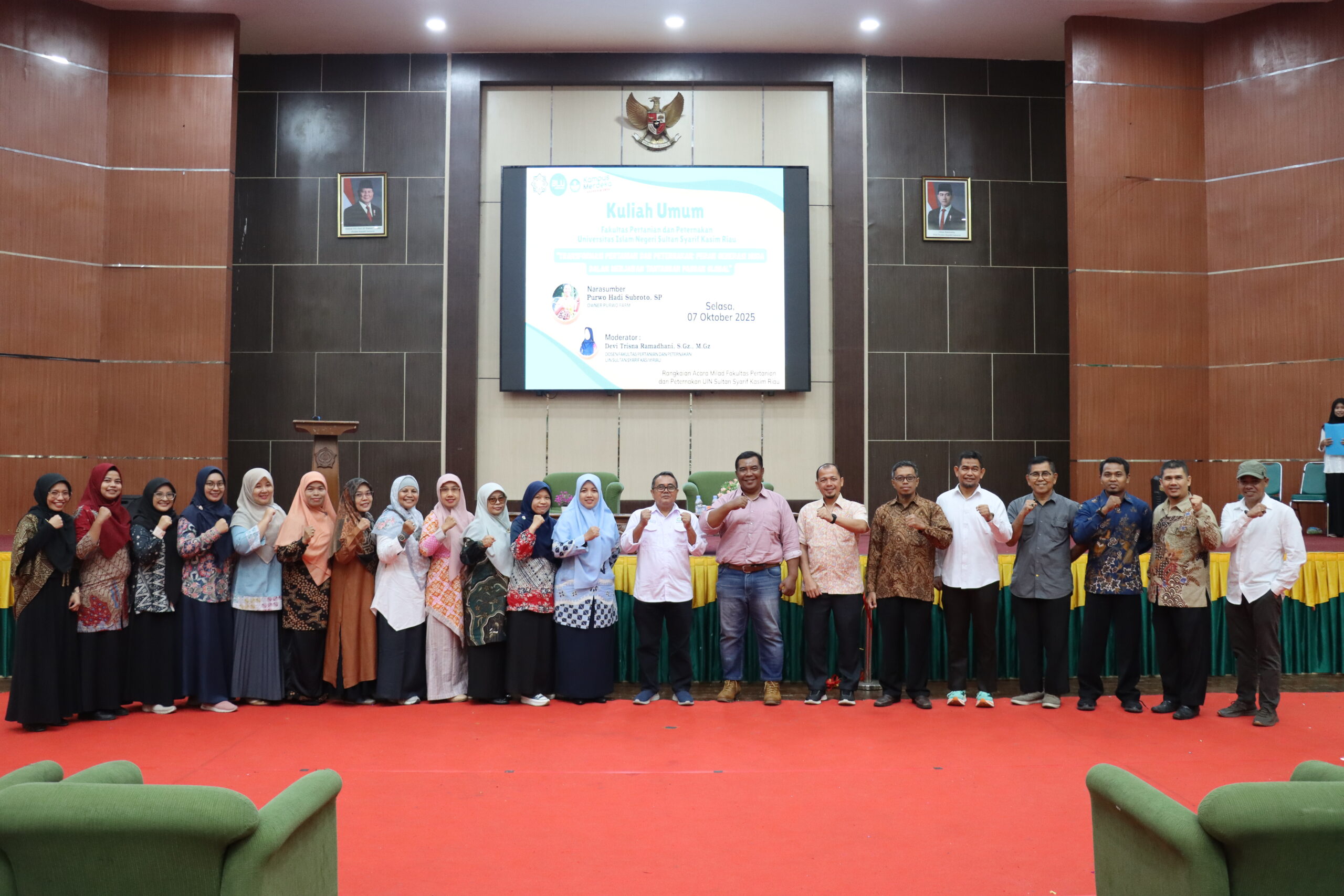 uin-suska.ac.id Fakultas Pertanian dan Peternakan (FPP) Universitas Islam Negeri Sultan Syarif Kasim (UIN Suska) Riau menyelenggarakan Kuliah Umum bertema “Transformasi Pertanian dan Peternakan: Peran Generasi Muda dalam Menjawab Tantangan Pangan Lokal” pada Selasa (7/10/2025). Acara ini merupakan upaya nyata FPP dalam menjawab tantangan ketahanan pangan nasional. Bertempat di Gedung Pusat Kegiatan Mahasiswa (PKM), acara ini dihadiri oleh Dekan, Wakil Dekan, Dosen, Tenaga Kependidikan, dan panitia. Ketua Panitia, Yusmar Mahmud, SP., M.Si, menegaskan pentingnya keterlibatan anak muda dalam memajukan sektor pangan berbasis inovasi dan teknologi.
