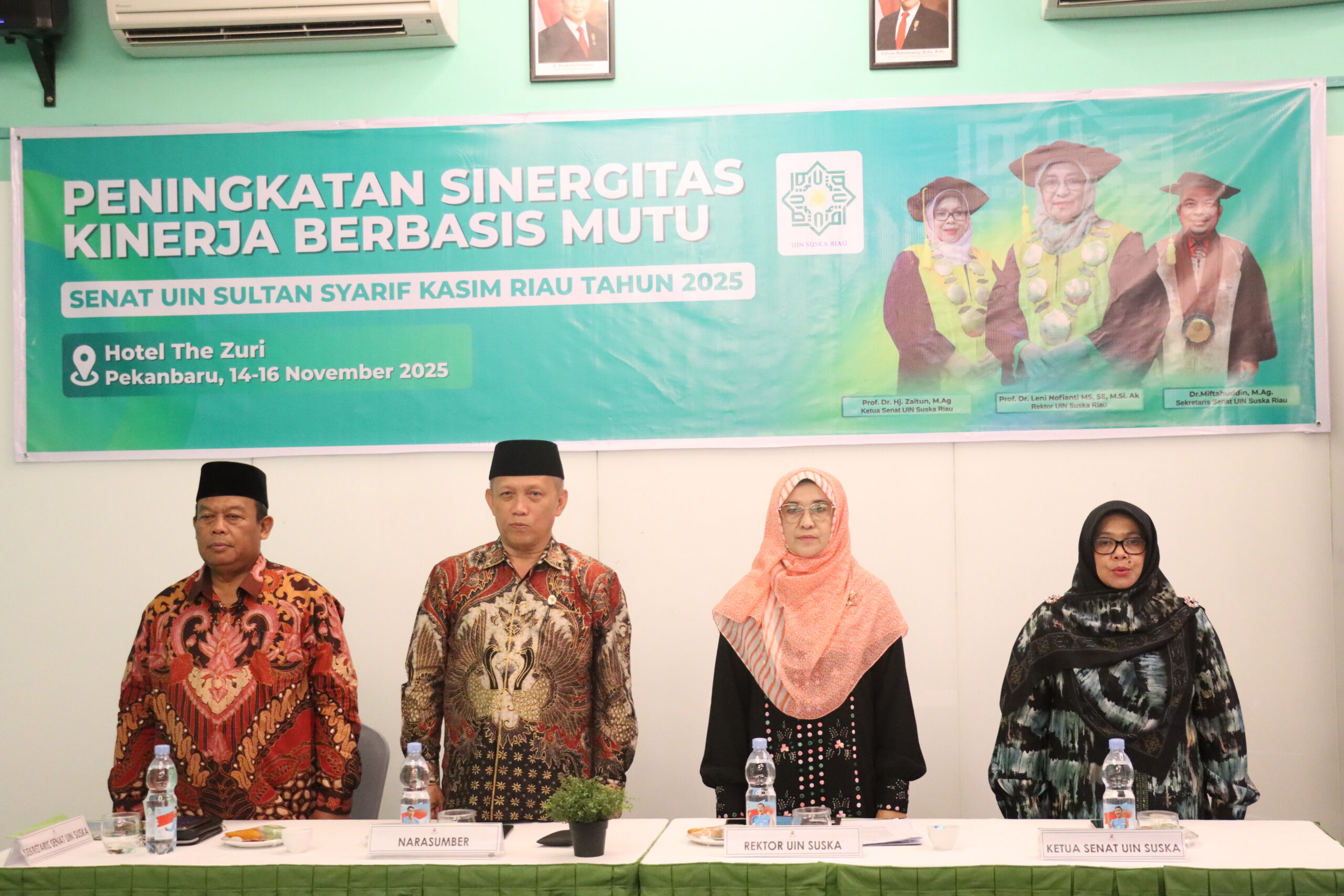 uin-suska.ac.id Upaya memperkuat tata kelola dan mutu kelembagaan Universitas Islam Negeri Sultan Syarif Kasim (UIN Suska) Riau dilakukan melalui pelaksanaan Kegiatan Peningkatan Sinergitas Kinerja Berbasis Mutu Senat UIN Suska Riau. Acara ini resmi dibuka pada Jumat, 14 November 2025, di salah satu hotel di Kota Pekanbaru, dan dihadiri oleh anggota Senat, Tim Renstra, Tim Statuta, Kepala Biro AUPK UIN Suska Riau, serta narasumber utama Prof. Dr. H. Mahmud, M.Si., CSEE, MCE.