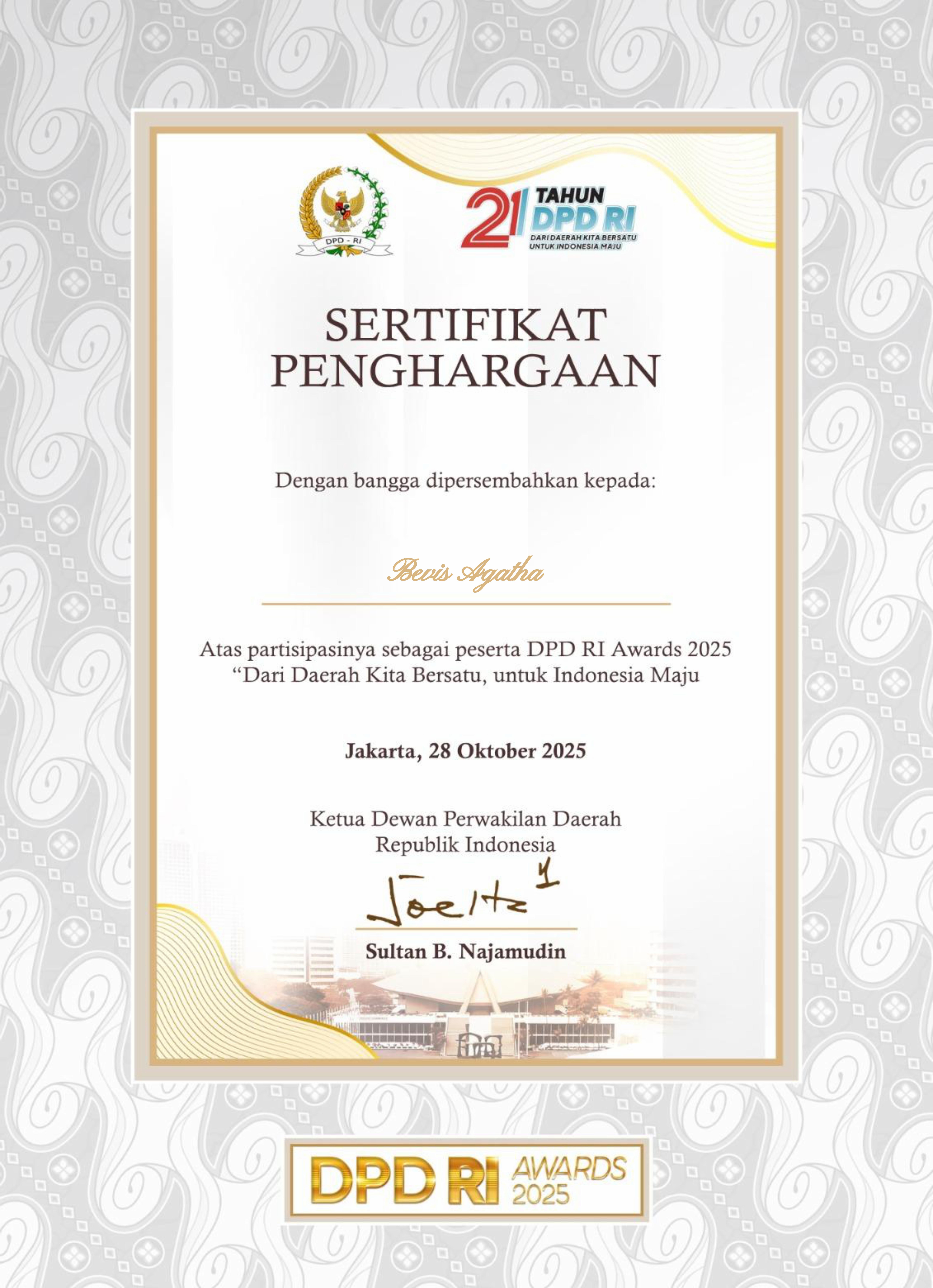 Pengakuan atas kontribusi dan kiprah positif Bevis Agatha berlanjut ke tingkat lembaga negara. Ia menjadi bagian dari acara bergengsi DPD RI Award 2025 yang dilaksanakan oleh Dewan Perwakilan Daerah Republik Indonesia (DPD RI) di The Tribrata Hotel, Dharmawangsa, Jakarta pada tanggal 28 Oktober 2025.