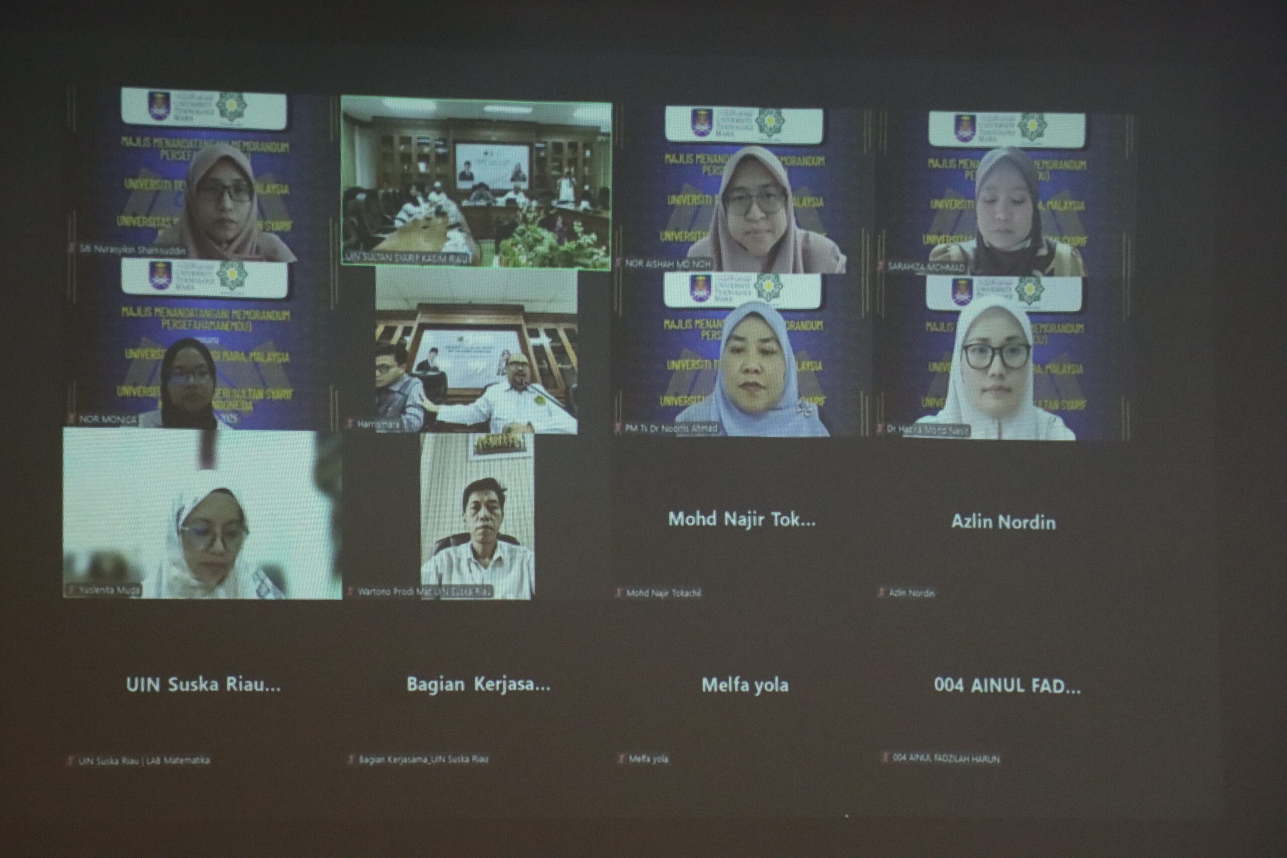 Dari pihak UIN Suska Riau turut hadir Wakil Rektor Bidang Akademik dan Pengembangan Lembaga Prof. Dr. Raihani, M.Ed., Ph.D, Wakil Rektor Bidang Kemahasiswaan dan Kerjasama Dr. Harris Simaremare, ST., MT, Dekan Fakultas Sains dan Teknologi Dr. Yuslenitamuda, S.T., M.T, serta Ketua International Office UIN Suska Riau, Dr. Endah Purnama Sari, Ph.D.