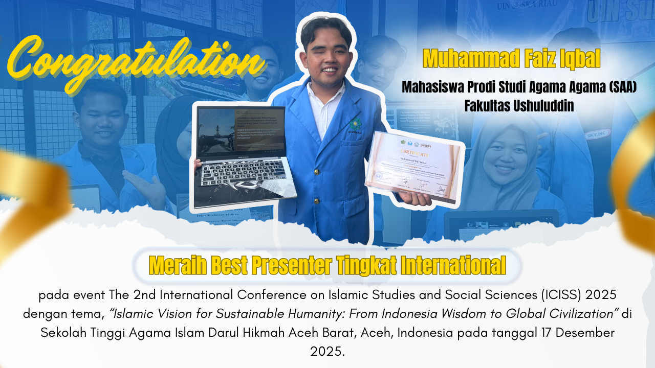 Pekanbaru, 27 Desember 2025 — Prestasi akademik tingkat internasional kembali ditorehkan mahasiswa Program Studi Studi Agama-Agama (SAA), Fakultas Ushuluddin, Universitas Islam Negeri Sultan Syarif Kasim Riau. Salah seorang mahasiswa Prodi SAA, Muhammad Faiz Iqbal, berhasil meraih Best Presenter Award dengan paper berjudul “Digital Education and the Reconfiguration of Religious Knowledge among Sakai Indigenous Youth: A Digital Religion Perspective”, pada The 2nd International Conference on Islamic Studies and Social Sciences (ICISSS) 2025, sebuah forum ilmiah internasional yang diikuti oleh peserta dari berbagai institusi pendidikan tinggi.