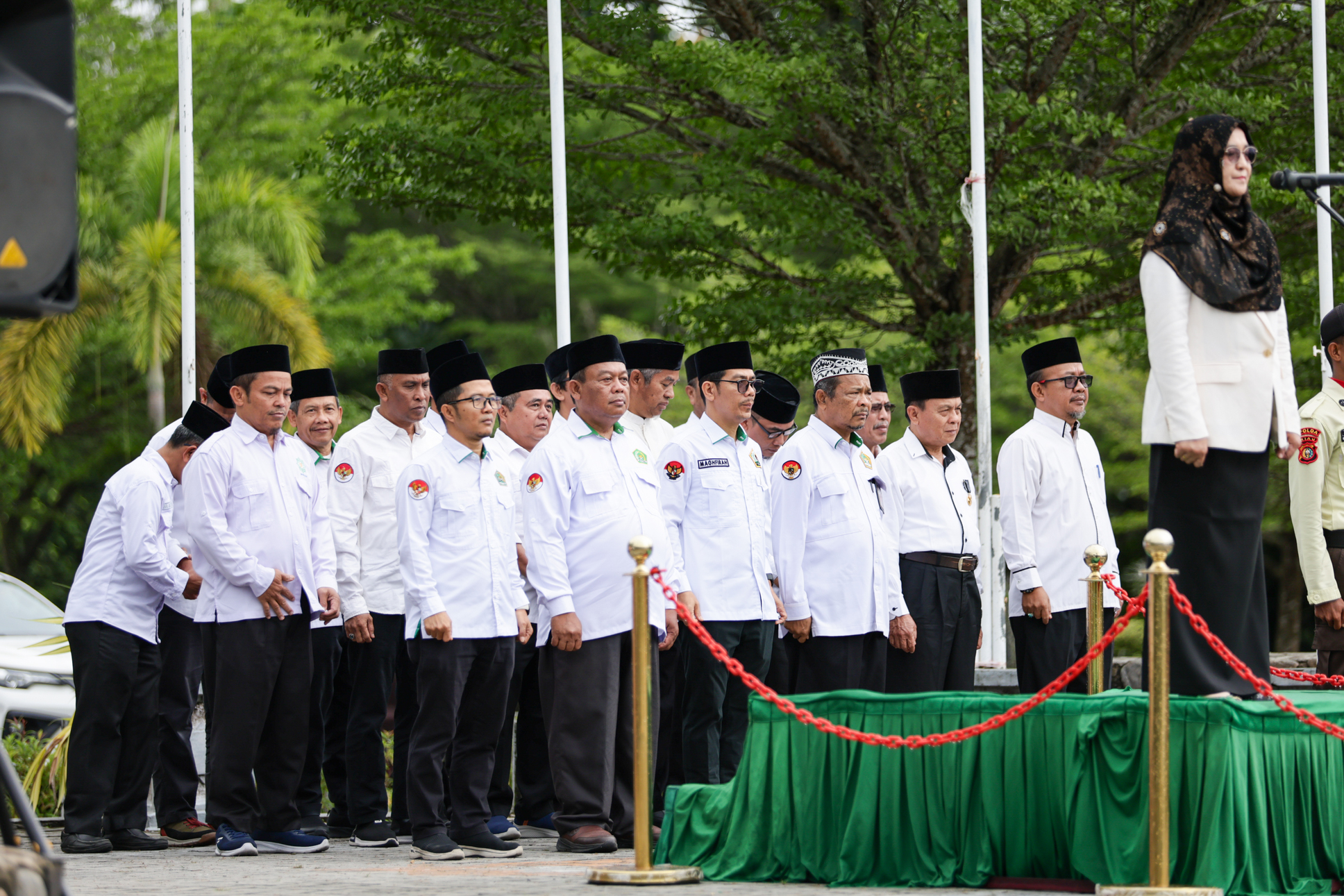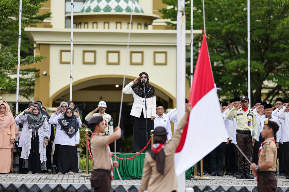 Rektor UIN Sultan Syarif Kasim Riau, Prof. Dr. Hj. Leny Nofianti, MS., S.E., M.Si., Ak., bertindak sebagai pembina upacara dan membacakan amanat Menteri Agama Republik Indonesia dengan tema “Umat Rukun dan Sinergi, Indonesia Damai dan Maju.”