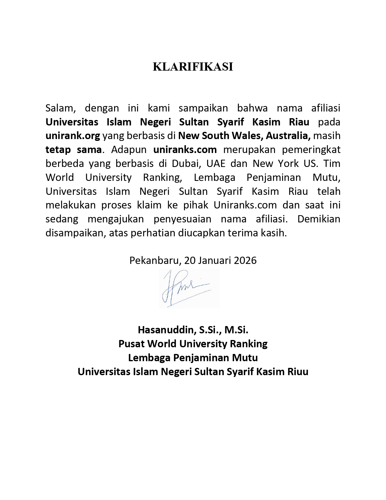 Klarifikasi Informasi Pemeringkatan UIN Suska Riau