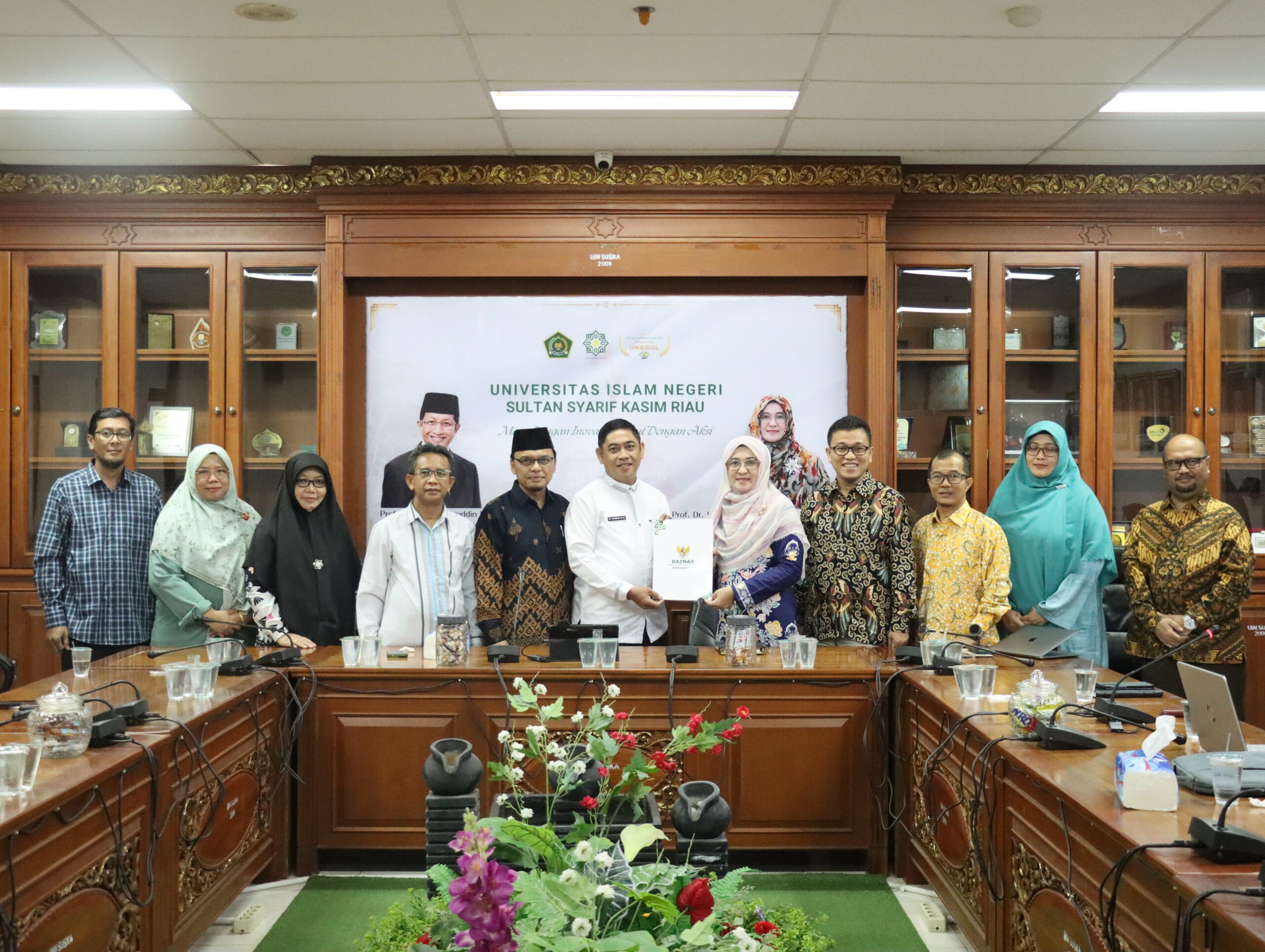 Kegiatan ini dihadiri oleh jajaran pimpinan universitas, meliputi Rektor, Wakil Rektor I, II, dan III, para Dekan dan Kepala Bagian (Kabag) di lingkungan UIN Suska Riau, serta segenap Tim Wakaf UIN Suska Riau.