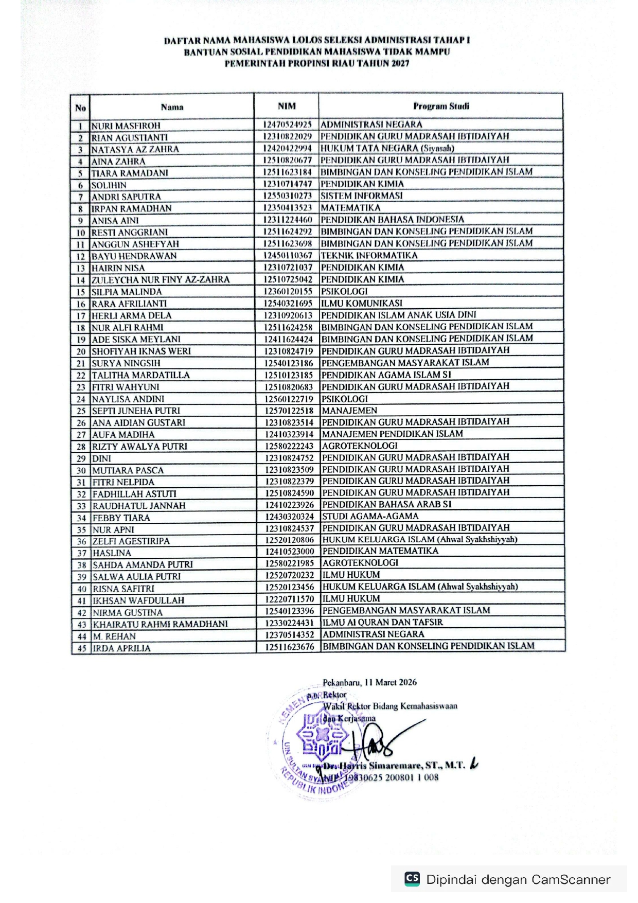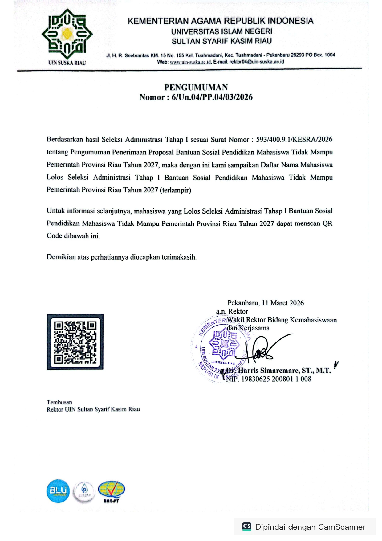 Pengumuman Penerimaan Proposal Bantuan Sosial Pendidikan Mahasiswa Tidak Mampu Pemerintah Provinsi Riau Tahun 2027