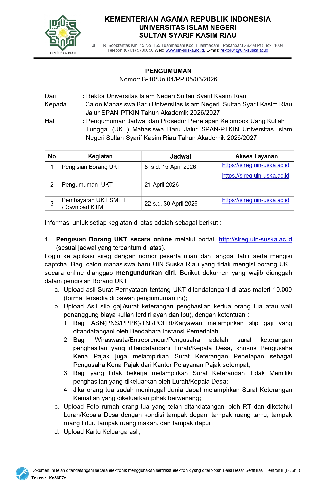Pengumuman Jadwal dan Prosedur Penetapan Kelompok Uang Kuliah Tunggal (UKT) Mahasiswa Baru Jalur SPAN-PTKIN Universitas Islam Negeri Sultan Syarif Kasim Riau Tahun Akademik 2026/2027