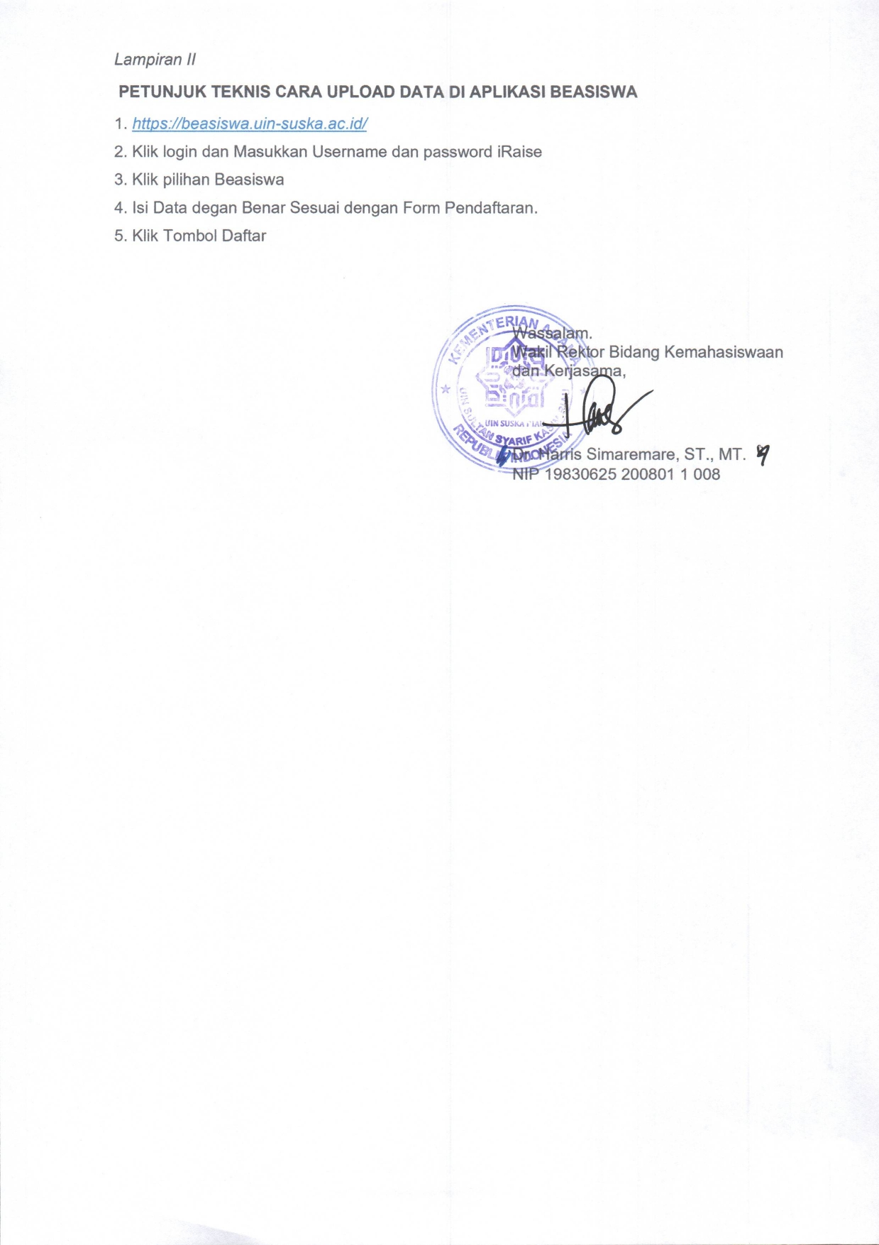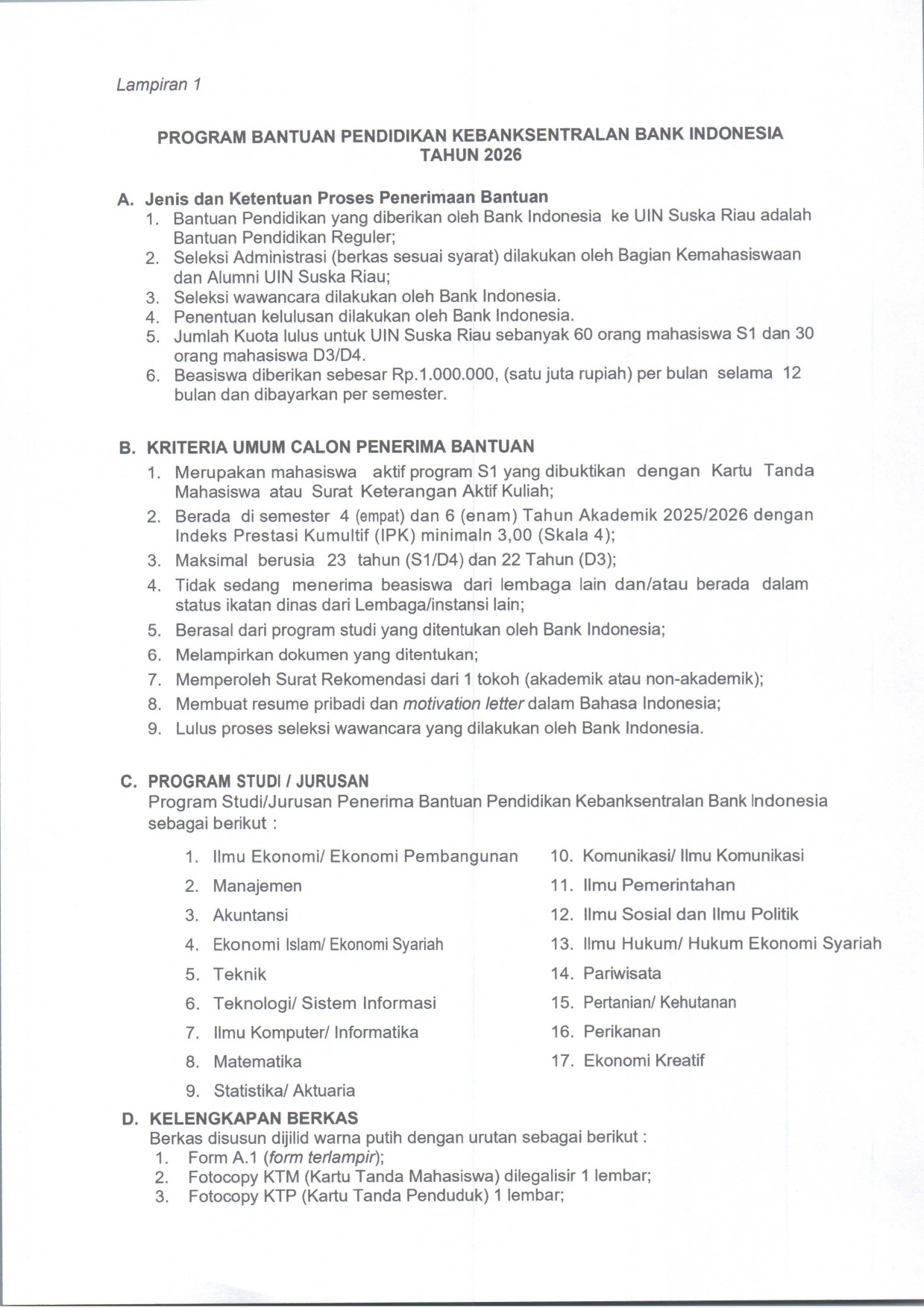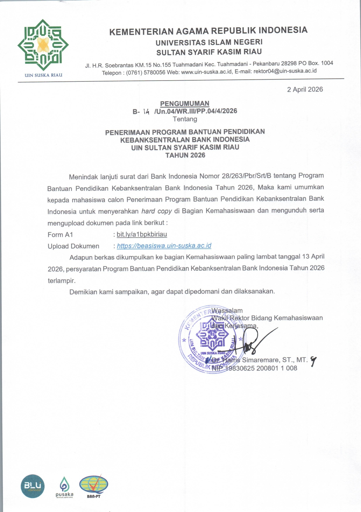 Penerimaan Program Bantuan Pendidikan Kebanksentralan Bank Indonesia UIN Sultan Syarif Kasim Riau Tahun 2026