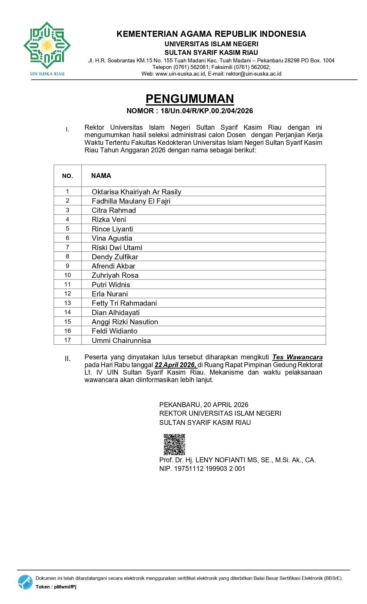 Pengumuman Hasil Seleksi Administrasi Calon Dosen dengan Perjanjian Kerja Waktu Tertentu Fakultas Kedokteran Universitas Islam Negeri Sultan Syarif Kasim Riau Tahun Anggaran 2026