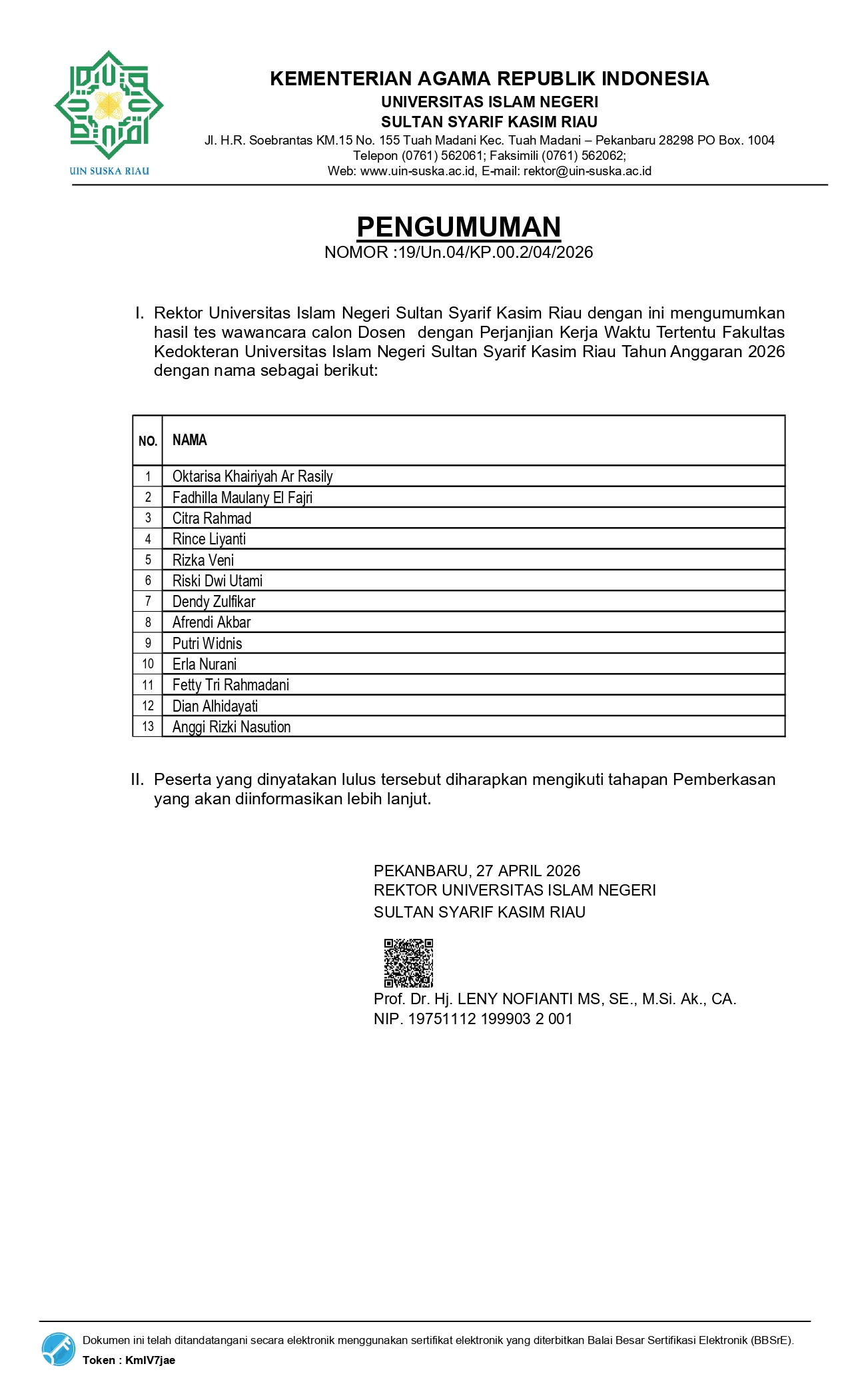 Pengumuman Hasil Tes Wawancara Calon Dosen dengan Perjanjian Kerja Waktu Tertentu Fakultas Kedokteran Universitas Islam Negeri Sultan Syarif Kasim Riau Tahun Anggaran 2026