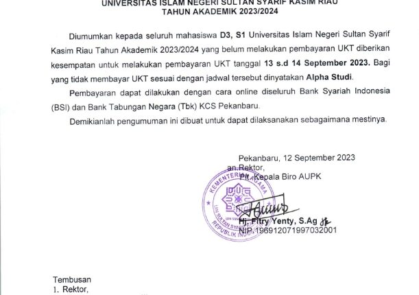 Pembayaran Biaya Pendidikan Semester Genap Program Diploma, Program Sarjana, Program Magister dan Program Doktor UIN Sultan Riau TA. 2025/2026
