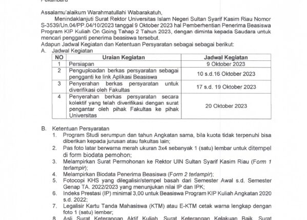 Surat Pengganti Penerima Beasiswa Program KIP Kuliah On Going Tahap 2 Tahun 2023